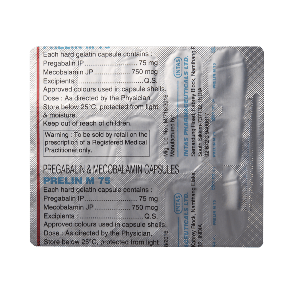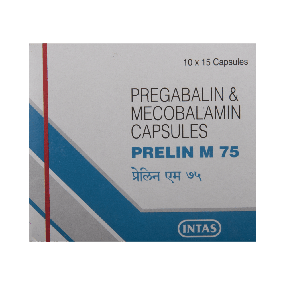 Prelin M 75 Capsule is a prescription medicine used for the treatment of neuropathic pain. It decreases pain by modulating the calcium channel activity of the nerve cells. This medicine also protects nerve fibers and heals damaged nerve cells. Prelin M 75 Capsule may be taken with or without food, preferably at bedtime. It is advised to take it at the same time each day as this helps to maintain a consistent level of medicine in the body. Take this medicine in the dose and duration advised by your doctor. If you miss a dose of this medicine, take it as soon as you remember. Finish the full course of treatment even if you feel better. This medication must not be stopped suddenly without talking to the doctor.Some common side effects of this medicine include nausea, vomiting, diarrhea, constipation, blurred vision, dizziness, and sleepiness. Do not drive or do anything that requires mental focus until you know how this medicine affects you. The side effects are mild and usually improve with time. It may also cause weight gain in some people. Exercise regularly and have a balanced diet to keep your weight in check. Inform your doctor if you develop any unusual changes in mood or behavior, new or worsening depression, or suicidal thoughts.Your doctor should also know about all other medicines you are taking, as many of these may make this medicine less effective or change the way it works. Inform your doctor if you are pregnant, planning pregnancy, or breastfeeding to make sure it is safe for you and the developing baby.