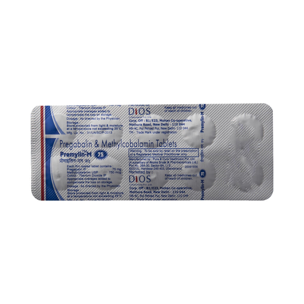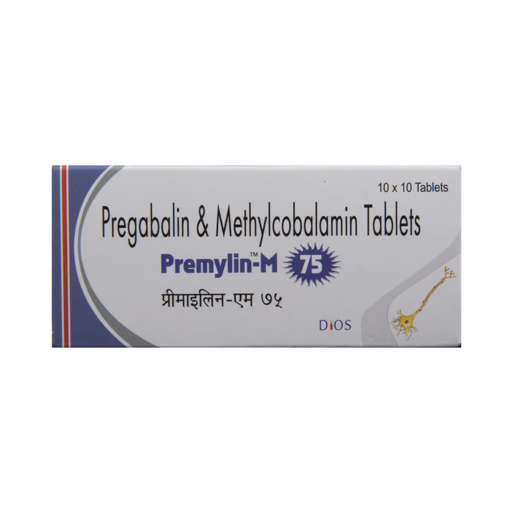 Premylin-M 75 Tablet is a prescription medicine used for the treatment of neuropathic pain. It decreases pain by modulating the calcium channel activity of the nerve cells. This medicine also protects nerve fibers and heals damaged nerve cells. Premylin-M 75 Tablet may be taken with or without food, preferably at bedtime. It is advised to take it at the same time each day as this helps to maintain a consistent level of medicine in the body. Take this medicine in the dose and duration advised by your doctor. If you miss a dose of this medicine, take it as soon as you remember. Finish the full course of treatment even if you feel better. This medication must not be stopped suddenly without talking to the doctor.Some common side effects of this medicine include nausea, vomiting, diarrhea, constipation, blurred vision, dizziness, and sleepiness. Do not drive or do anything that requires mental focus until you know how this medicine affects you. The side effects are mild and usually improve with time. It may also cause weight gain in some people. Exercise regularly and have a balanced diet to keep your weight in check. Inform your doctor if you develop any unusual changes in mood or behavior, new or worsening depression, or suicidal thoughts.Your doctor should also know about all other medicines you are taking, as many of these may make this medicine less effective or change the way it works. Inform your doctor if you are pregnant, planning pregnancy, or breastfeeding to make sure it is safe for you and the developing baby.
