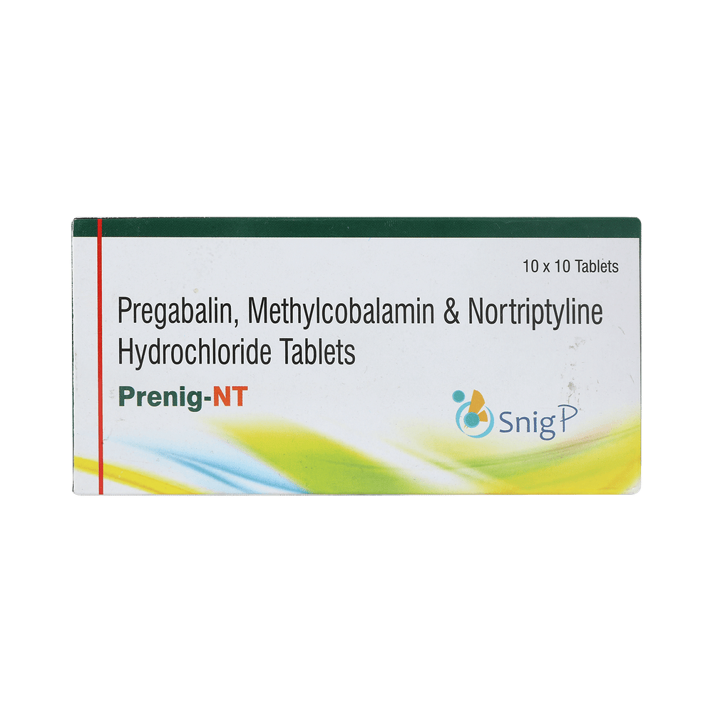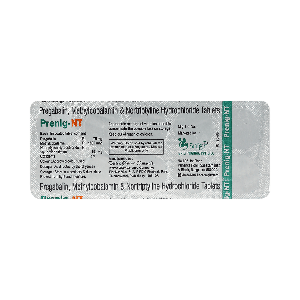 Prenig NT 75mg/10mg/1500mcg Tablet is a combination of three medicines: Pregabalin, Nortriptyline and Methylcobalamin. Pregabalin is an alpha 2 delta ligand which decreases pain by modulating calcium channel activity of the nerve cells. Nortriptyline is a tricyclic antidepressant which increases the levels of chemical messengers (serotonin and noradrenaline) that stop the movement of pain signals in the brain. Methylcobalamin is a form of vitamin B which helps in the production of myelin, a substance that protects nerve fibers and rejuvenates damaged nerve cells. Together, they relieve neuropathic pain (pain from damaged nerves).