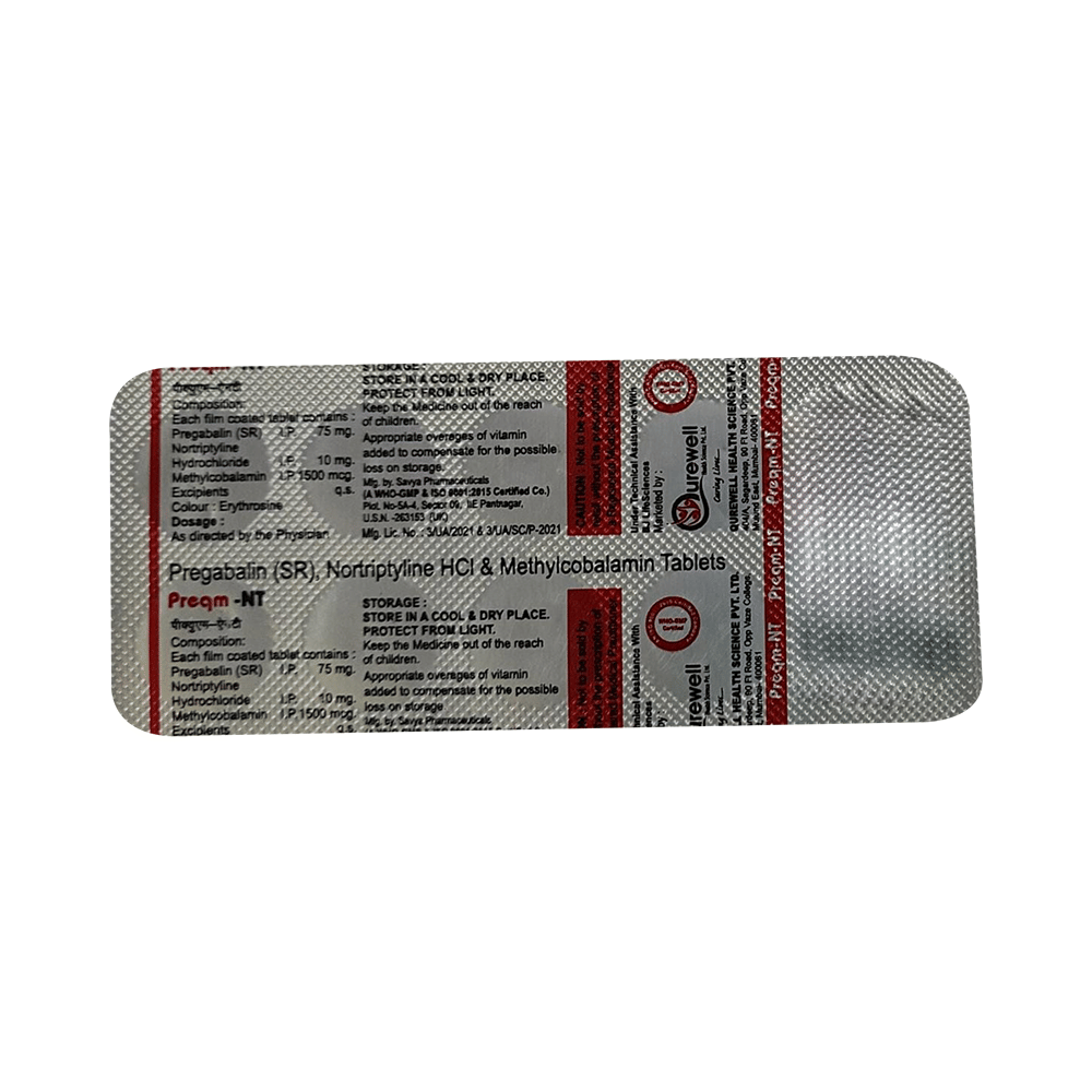 Preqm NT 75mg/10mg/1500mcg Tablet is a combination of three medicines: Pregabalin, Nortriptyline and Methylcobalamin. Pregabalin is an alpha 2 delta ligand which decreases pain by modulating calcium channel activity of the nerve cells. Nortriptyline is a tricyclic antidepressant which increases the levels of chemical messengers (serotonin and noradrenaline) that stop the movement of pain signals in the brain. Methylcobalamin is a form of vitamin B which helps in the production of myelin, a substance that protects nerve fibers and rejuvenates damaged nerve cells. Together, they relieve neuropathic pain (pain from damaged nerves).