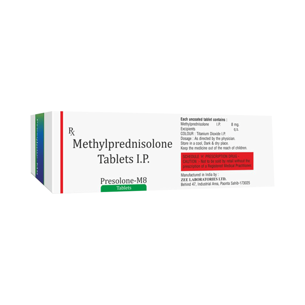 In Treatment of Allergic conditionsPresolone-M8 Tablet is used to treat different inflammatory and allergic conditions including arthritis, lupus, psoriasis, ulcerative colitis which affect the skin, blood, eyes, lungs, stomach, and nervous system. It works by lowering your immune system’s response to these conditions thereby reducing symptoms such as swelling, pain, itching and other allergic-type reactions.This medicine is given orally (by mouth). You should always take it as it has been prescribed for you. Do not stop taking it without your doctor’s advice. This can cause unpleasant withdrawal symptoms. Because this medicine weakens your immune system, you should avoid being near people who are ill or have infections.In Treatment of Systemic lupus erythematosus (SLE)Systemic lupus erythematosus (SLE) is an autoimmune disease. In this disease, the immune system of the body mistakenly attacks healthy tissue. It can affect the skin, joints, kidneys, brain, and other organs. Presolone-M8 Tablet prevents the release of substances in the body that cause inflammation. It lowers your immune system’s response and reduces symptoms such as swelling, pain, itching and other allergic-type reactions.In Treatment of Skin disordersPresolone-M8 Tablet prevents the release of substances in the body that cause inflammation. It can be used to treat different inflammatory and allergic conditions of the skin such as eczema and psoriasis. It works by lowering your immune system’s response to these conditions thereby relieving symptoms such as swelling, pain, itching and other allergic-type reactions.In Treatment of Eye disordersPresolone-M8 Tablet helps relieve symptoms of eye infections such as redness, swelling, itching and watering of eyes. This medicine works by decreasing the production of certain chemicals that cause inflammation of the eyes. This will make it easier for you to go about your daily activities. Use it as prescribed to get the most benefit. If you see no improvement even after a week, talk to your doctor.In Treatment of Rheumatic disorderRheumatic disorder is an autoimmune condition where your body’s immune system (which usually fights bacteria and viruses) attacks your body’s own cells. Presolone-M8 Tablet stops that from happening and can relieve the symptoms of this condition such as pain, swelling, and stiffness in your joints. It can also slow down joint damage, reduce disability, and enable you to be as active for as long as possible. It can take several weeks or months to notice the effect of the medicine. You should continue taking it until your doctor says it is okay to stop using the medicine.show moreshow less