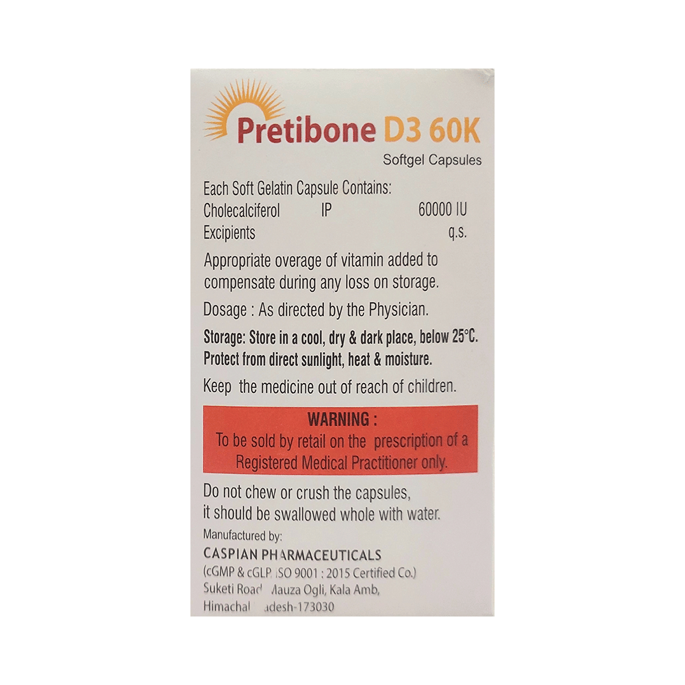 Pretibone D3 60K Softgel Capsule is a form of vitamin D. It raises vitamin D levels in your blood. This, in turn, increases calcium levels in your blood by helping you absorb more calcium from food.