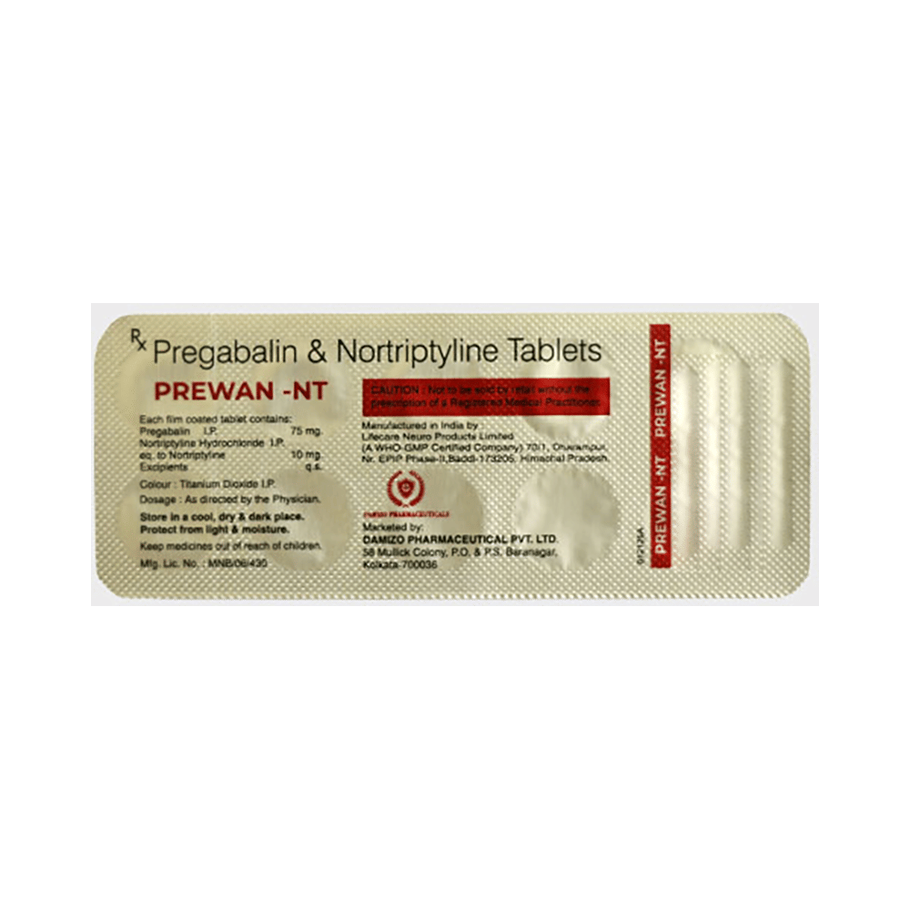 Prewan-NT Tablet is a combination of two medicines: Pregabalin and Nortriptyline. Pregabalin is an alpha-2 delta ligand that decreases pain by modulating the calcium channel activity of the nerve cells. Nortriptyline is a tricyclic antidepressant that increases the levels of chemical messengers (serotonin and noradrenaline) that stop the movement of pain signals in the brain. Together, they relieve neuropathic pain (pain from damaged nerves).
