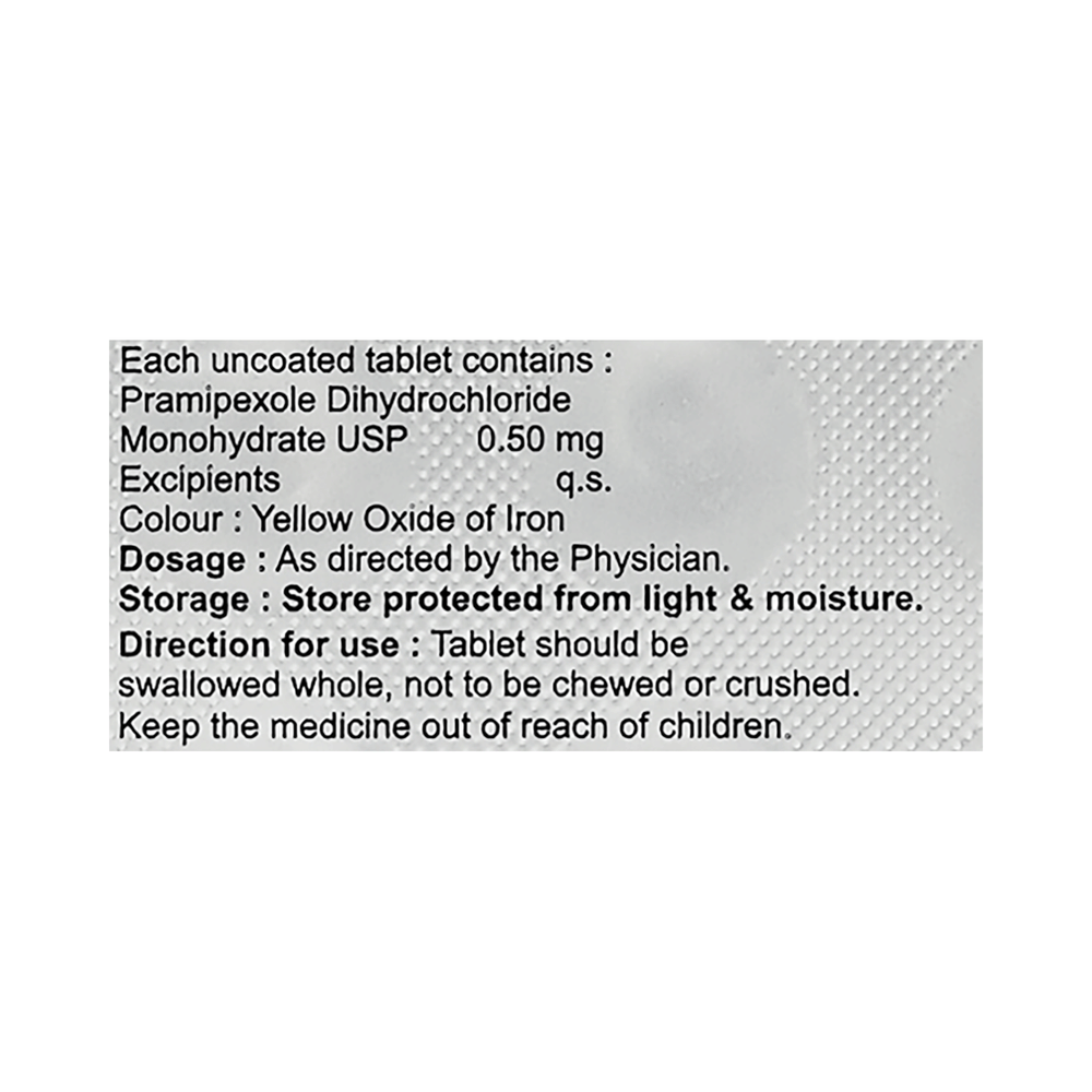 Prexol 0.50 Tablet is used in the treatment of Parkinson's disease and restless leg syndrome (an urge to move the legs usually accompanied or caused by uncomfortable and unpleasant leg sensations). It helps to treat excessive shaking by slowing down the body movements. Prexol 0.50 Tablet should be taken with food. However, take it at the same time each day as this helps to maintain a consistent level of medicine in the body. Take this medicine in the dose and duration as advised by your doctor and if you have missed a dose, take it as soon as you remember it. You should never skip any doses and finish the full course of treatment even if you feel better. This medication must not be stopped suddenly without talking to your doctor.Some common side effects of this medicine include nausea, dry mouth, fatigue, hallucinations, constipation, and peripheral edema. It also causes dizziness and sleepiness, so do not drive or do anything that requires mental focus until you know how this medicine affects you. Inform your doctor if you develop any unusual changes in mood, an abnormally high sex drive, an urge to gamble, or uncontrolled spending as these may prove very harmful.