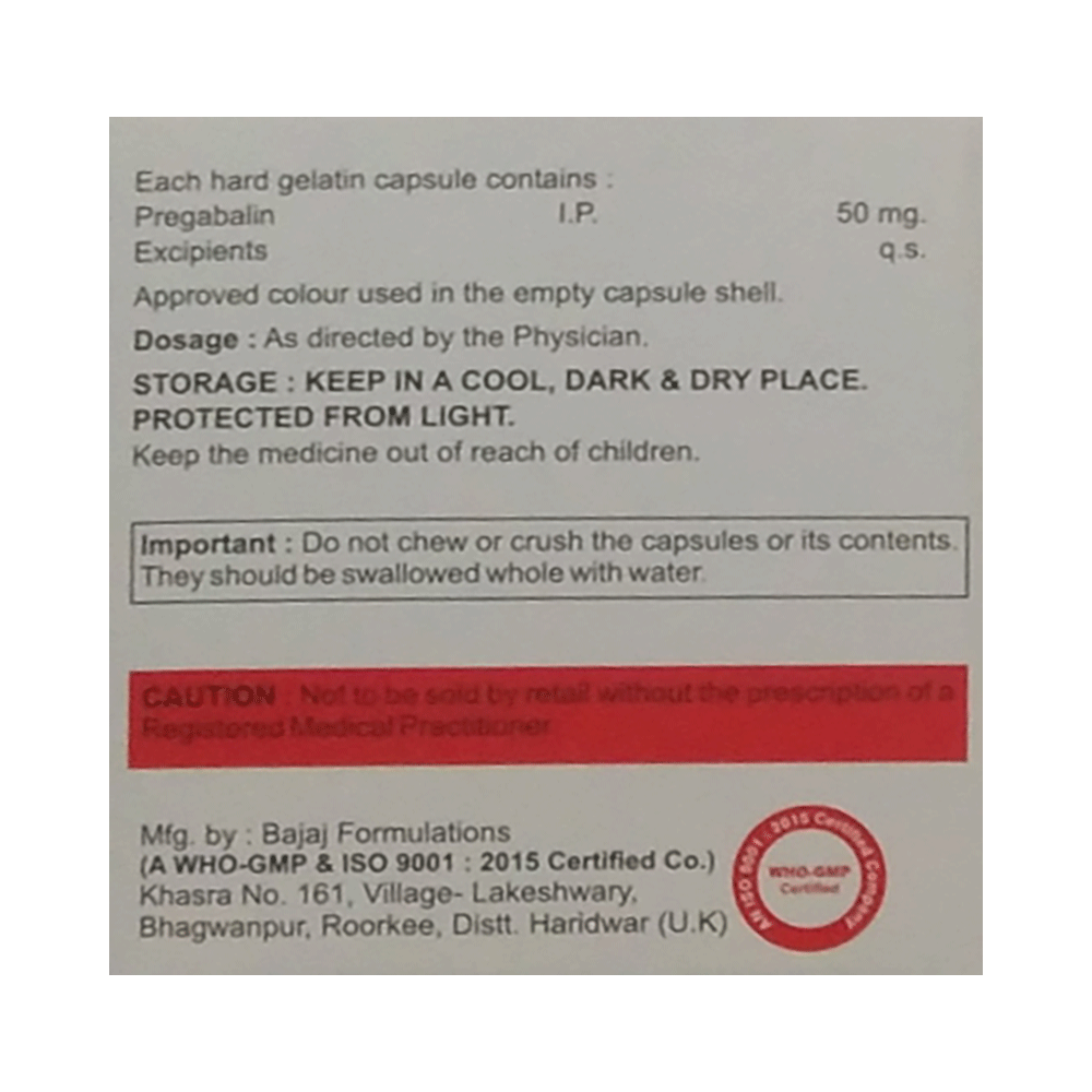 Salt Composition: Pregabalin (50mg)