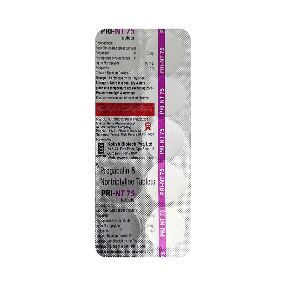 Pri-NT Tablet is a combination of two medicines: Pregabalin and Nortriptyline. Pregabalin is an alpha-2 delta ligand that decreases pain by modulating the calcium channel activity of the nerve cells. Nortriptyline is a tricyclic antidepressant that increases the levels of chemical messengers (serotonin and noradrenaline) that stop the movement of pain signals in the brain. Together, they relieve neuropathic pain (pain from damaged nerves).