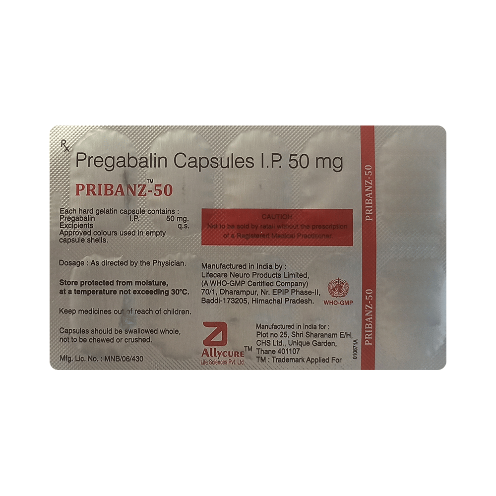 Pribanz 50 Capsule is a medicine used to relieve pain caused by nerve damage (neuropathic pain) due to diabetes, shingles (herpes zoster infection), spinal cord injury, or other conditions. It is also used to treat widespread muscle pain and stiffness in people with fibromyalgia. Pribanz 50 Capsule belongs to the anti-epileptic group of medicines and can also be used to treat certain types of seizures (fits) in combination with other medicines. Additionally, it may also be prescribed to treat the symptoms of anxiety disorder if other medicines are not suitable.You can take Pribanz 50 Capsule with or without food, but it is important to take this medicine at the same time each day to get the most benefit. The exact dose and duration of treatment will depend on your condition and how you respond to it. Your doctor will probably start this medicine at a low dose and increase it gradually. It may take a few weeks for the medicine to work properly. Follow your doctor’s instructions and continue taking it regularly until your doctor advises you to stop. Do not miss any dose, otherwise, your condition may worsen.The side effects of this medicine are usually mild and go away by themselves. The most common ones are feeling sleepy or dizzy, dryness in the mouth, blurred vision, weight gain, edema (swelling over the whole body), and difficulty in concentrating. Most side effects are not serious and do not need medical attention. Talk to your doctor about potential side effects and ways in which you might prevent or cope with them.Before taking the medicine you should tell your doctor if you are pregnant, breastfeeding, or planning to become pregnant. Be careful while driving as sleepiness, dizziness, and blurring of vision may be seen as side effects. You should avoid drinking alcohol along with this medicine as it may lead to excessive sleepiness and dizziness.