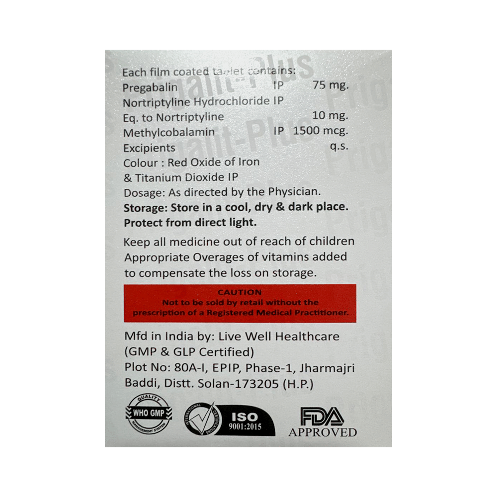 Prigalit-Plus Tablet is a combination of three medicines: Pregabalin, Nortriptyline and Methylcobalamin. Pregabalin is an alpha 2 delta ligand which decreases pain by modulating calcium channel activity of the nerve cells. Nortriptyline is a tricyclic antidepressant which increases the levels of chemical messengers (serotonin and noradrenaline) that stop the movement of pain signals in the brain. Methylcobalamin is a form of vitamin B which helps in the production of myelin, a substance that protects nerve fibers and rejuvenates damaged nerve cells. Together, they relieve neuropathic pain (pain from damaged nerves).