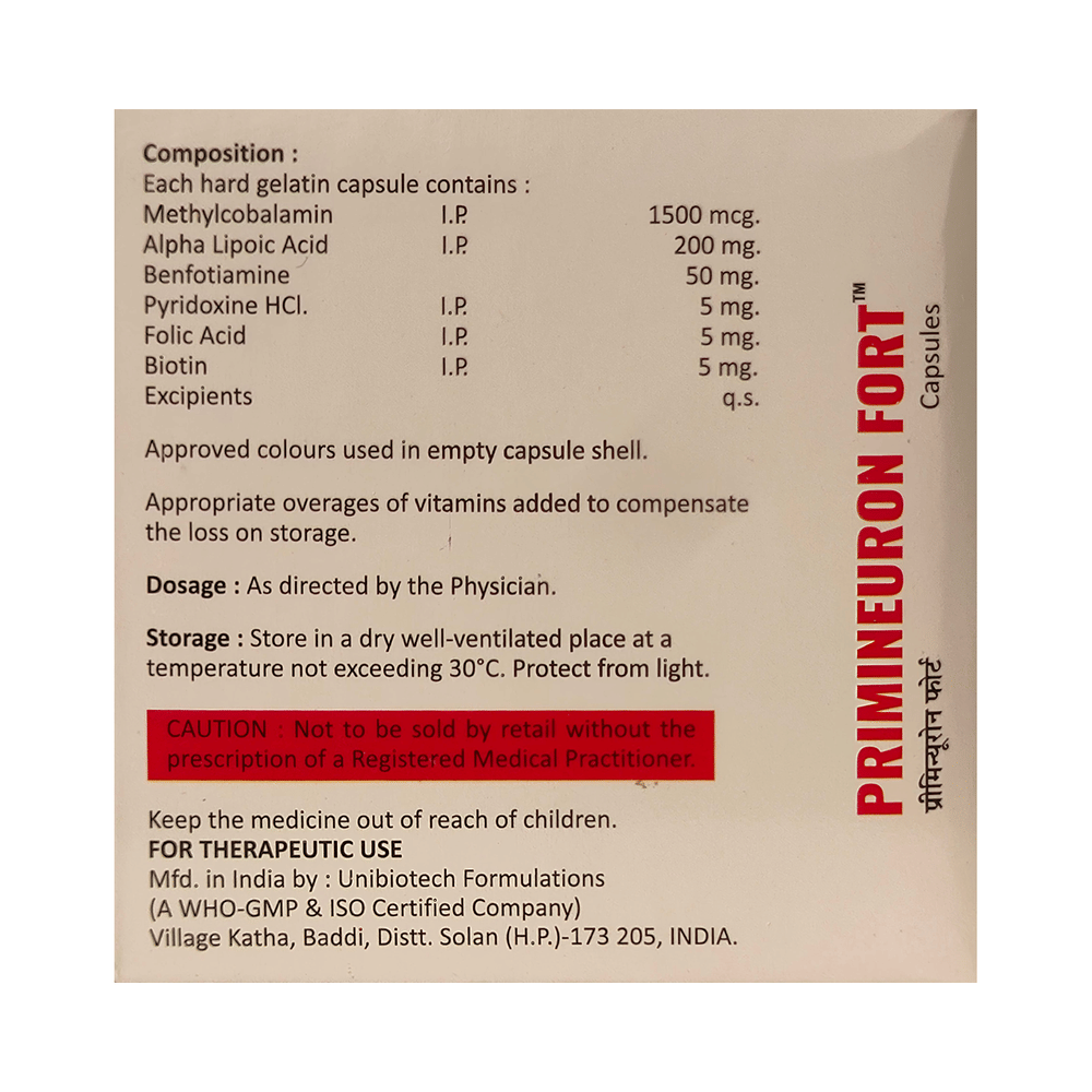 Primineuron Fort Capsule is a combination of six nutritional supplements: Methylcobalamin, Vitamin B6 (Pyridoxine), Benfotiamine, Alpha Lipoic Acid, Folic Acid and Biotin which replenish the body's stores of important nutrients.