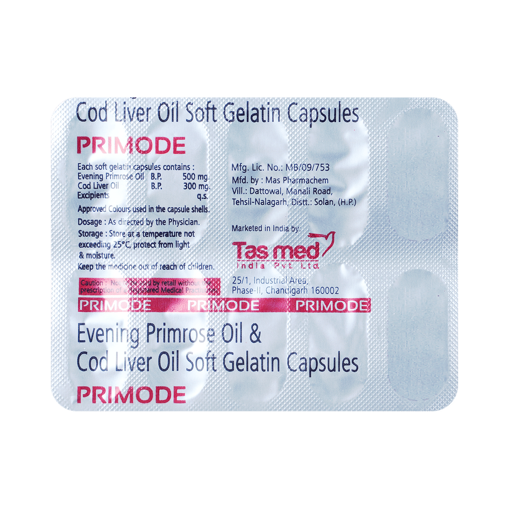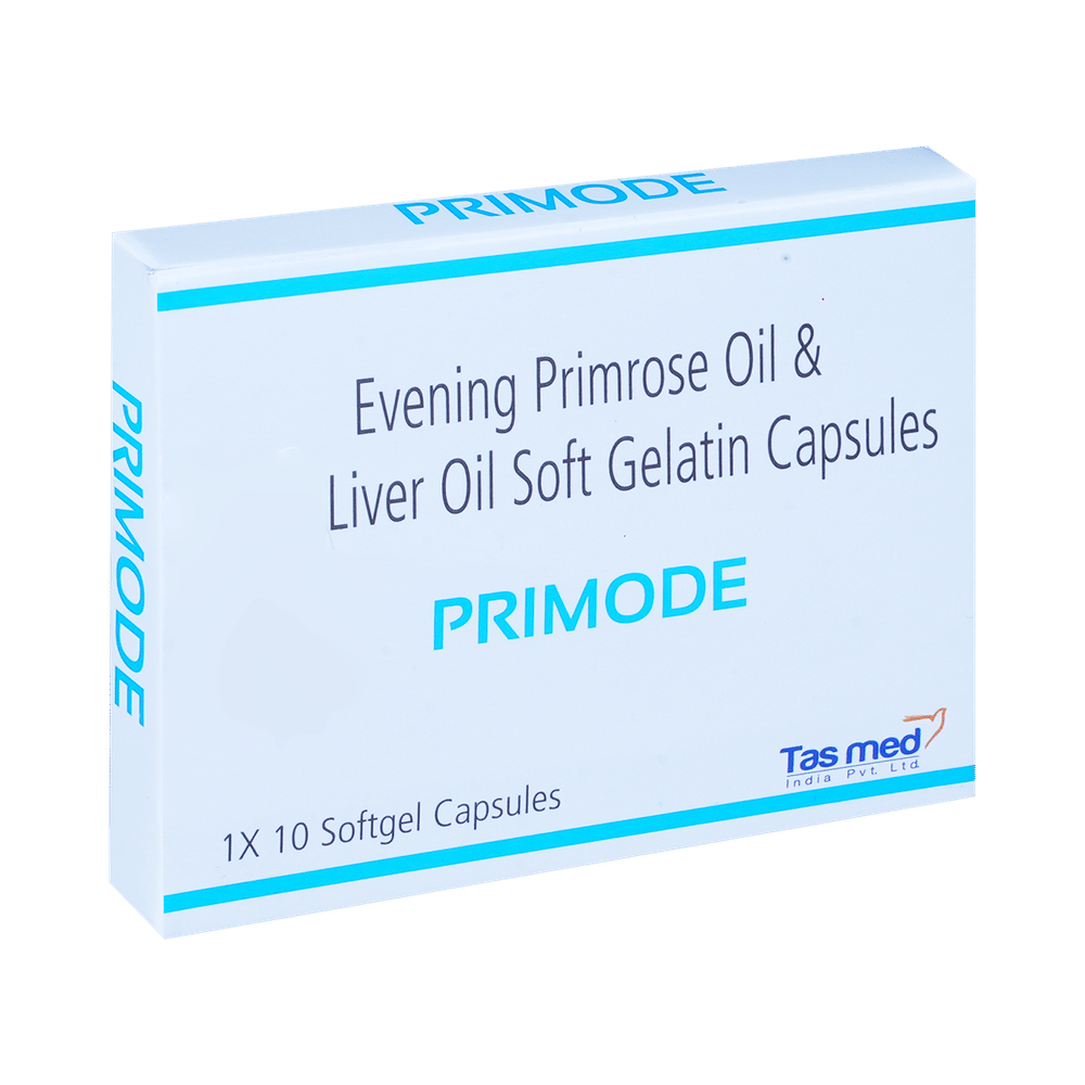 Primode Capsule is a nutritional supplement used to treat and prevent nutritional deficiencies. It provides essential fatty acids and vitamins A and D. It helps reduce inflammation, improve skin and cardiovascular health, support bone and immune function, promote hormonal balance, and support overall health. Take Primode Capsule in the dose and duration provided by your doctor or as indicated on the product label. It is best taken with meals to improve absorption and reduce the chance of stomach upset. Take it regularly and at the same time each day. Maintain a balanced diet and a healthy lifestyle to complement the benefits of the supplement.Primode Capsule is generally safe and well-tolerated. However, some people may experience mild side effects such as gastrointestinal discomfort, nausea, or headaches. Most side effects are temporary and resolve as your body adjusts to the supplement. To minimize these effects, take the medicine with food and plenty of water. If side effects persist or become severe, discontinue use and consult your doctor.Before taking Primode Capsule, inform your doctor if you have any underlying health conditions or are taking other medications, as there may be interactions. Avoid using this medicine if you are allergic to fish or any of the capsule ingredients. Pregnant or breastfeeding women should seek medical advice before use.