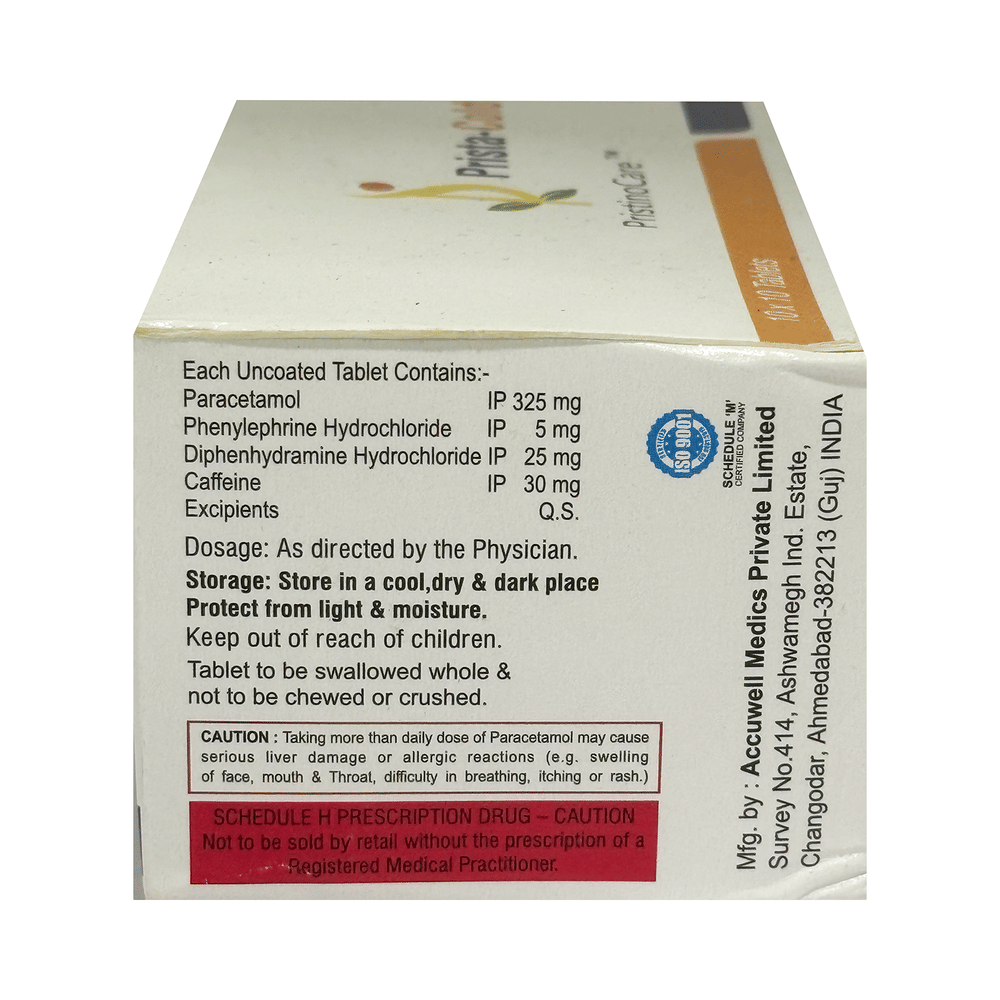 Prista-Cold Tablet is a combination of four medicines: caffeine, diphenhydramine, paracetamol, and phenylephrine, which relieve common cold symptoms. Diphenhydramine is an antiallergic that relieves allergy symptoms like a runny nose, watery eyes, and sneezing. Paracetamol is an analgesic (pain reliever) and an antipyretic (fever reducer). It blocks the release of certain chemical messengers in the brain that are responsible for pain and fever. Caffeine increases the effectiveness of paracetamol and decreases the sleepiness caused by diphenhydramine. Phenylephrine is a decongestant that narrows the small blood vessels, providing temporary relief from congestion or stuffiness in the nose.