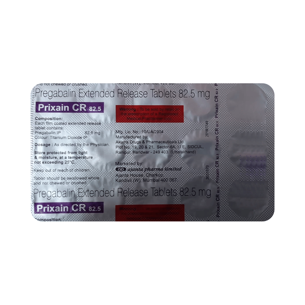 Prixain CR 82.5 Tablet is a medicine used to relieve pain caused by nerve damage (neuropathic pain) due to diabetes, shingles (herpes zoster infection), spinal cord injury, or other conditions. It is also used to treat widespread muscle pain and stiffness in people with fibromyalgia. Prixain CR 82.5 Tablet belongs to the anti-epileptic group of medicines and can also be used to treat certain types of seizures (fits) in combination with other medicines. Additionally, it may also be prescribed to treat the symptoms of anxiety disorder if other medicines are not suitable.You can take Prixain CR 82.5 Tablet with or without food, but it is important to take this medicine at the same time each day to get the most benefit. The exact dose and duration of treatment will depend on your condition and how you respond to it. Your doctor will probably start this medicine at a low dose and increase it gradually. It may take a few weeks for the medicine to work properly. Follow your doctor’s instructions and continue taking it regularly until your doctor advises you to stop. Do not miss any dose, otherwise, your condition may worsen.The side effects of this medicine are usually mild and go away by themselves. The most common ones are feeling sleepy or dizzy, dryness in the mouth, blurred vision, weight gain, edema (swelling over the whole body), and difficulty in concentrating. Most side effects are not serious and do not need medical attention. Talk to your doctor about potential side effects and ways in which you might prevent or cope with them.Before taking the medicine you should tell your doctor if you are pregnant, breastfeeding, or planning to become pregnant. Be careful while driving as sleepiness, dizziness, and blurring of vision may be seen as side effects. You should avoid drinking alcohol along with this medicine as it may lead to excessive sleepiness and dizziness.