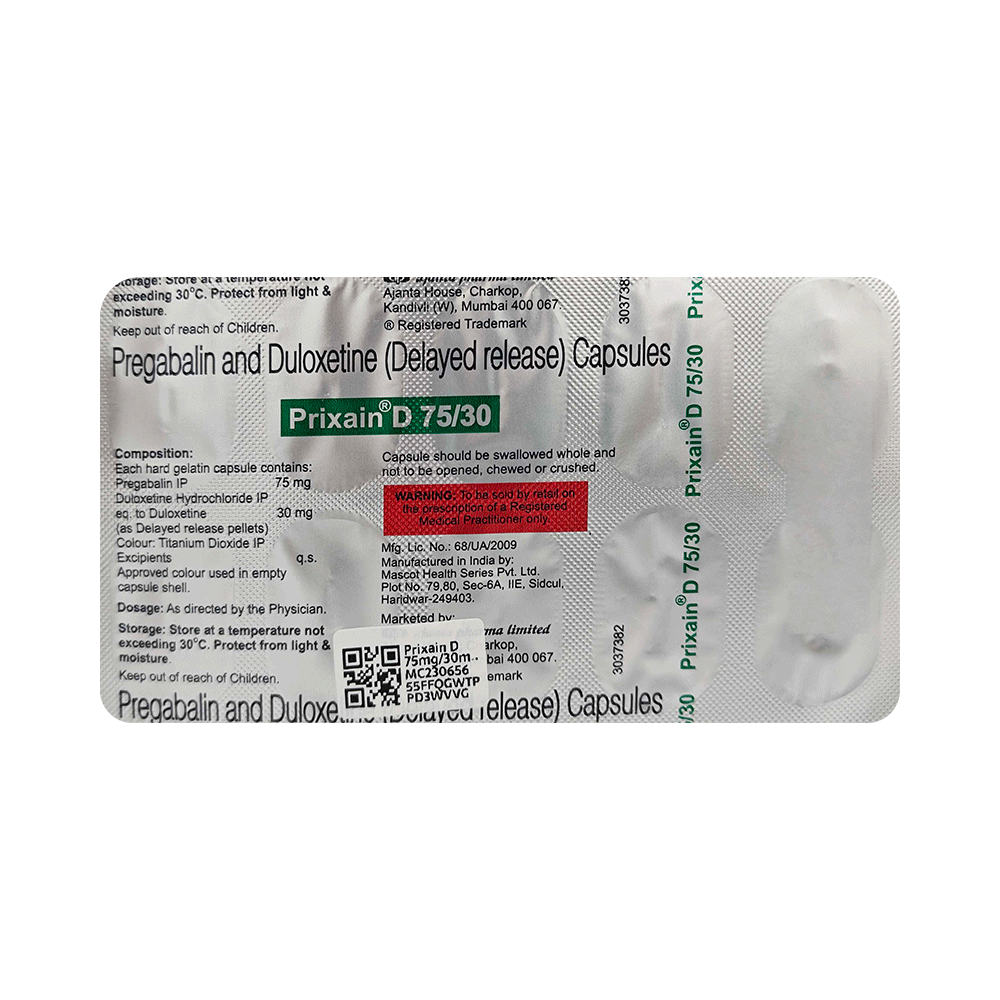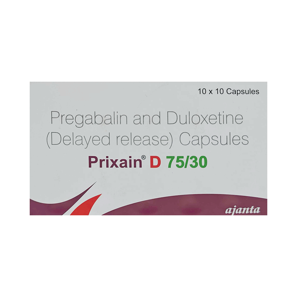Prixain D 75mg/30mg Capsule DR is a combination of two medicines: pregabalin and duloxetine. Pregabalin decreases neurotransmitter release, while duloxetine boosts serotonin and norepinephrine levels to modulate pain perception, working together to relieve nerve pain.