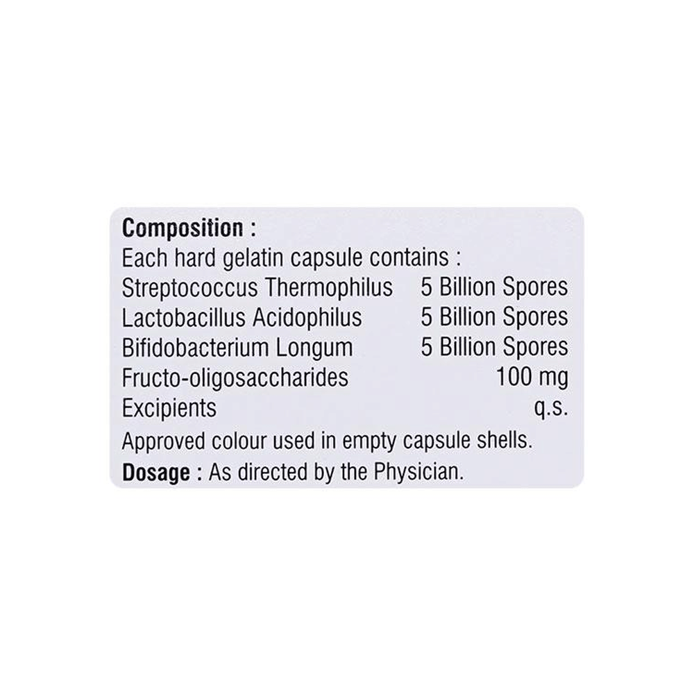 Salt Composition: Bifidobacterium longum (5Million spores) + Fructo Oligosaccharide (100mg) + Lactobacillus Acidophilus (5Million spores) + Streptococcus Thermophilus (5Million spores)