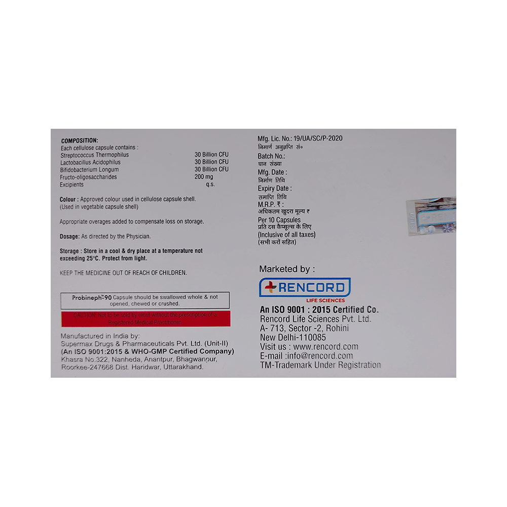 Probineph 90 Capsule is a prebiotic combination that is used to treat chronic kidney disease. It metabolizes various nitrogenous wastes that diffuse from the bloodstream into the bowel and promotes healthy gut flora. This way, it reduces the uremic toxins in renal-impaired patients. Take Probineph 90 Capsule in the dose and duration as prescribed by your doctor, as taking more than the recommended dose may cause undesirable side effects. Also, it is advised to take this medicine at a fixed time to avoid missing a dose.Generally, Probineph 90 Capsule has little or no side effects. However, some people may experience gas or flatulence. These effects usually disappear after 2 to 3 weeks of continuous usage, but if they persist or get worse, consult with your doctor.To make sure that Probineph 90 Capsule is safe for you, let your doctor know if you have any other health conditions. Inform them if you are taking any other medicines or are pregnant, or are breastfeeding.
