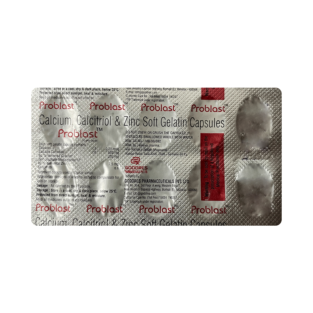 Problast Capsule is a combination of medicines that is used to treat nutritional deficiencies. It helps in the absorption of calcium and bone strengthening. It helps in proper growth and development of bones. It also helps in protein synthesis and the production of blood cells (red and white blood cells). Problast Capsule may be taken with or without food. It should be used in the dose and duration as prescribed by your doctor. It is advised to take this medicine at a fixed time.This medicine should not be taken more than the recommended dose. It is usually a safe medicine with very minimal or no side effects. However, if you experience severe diarrhea, vomiting, or constipation, you should consult your doctor without delay.Before taking this medicine, tell your doctor if you have any other health conditions. Inform your doctor if you are taking any other medicines or if you are pregnant or breastfeeding. It is advised not to take alcohol after taking this medicine.