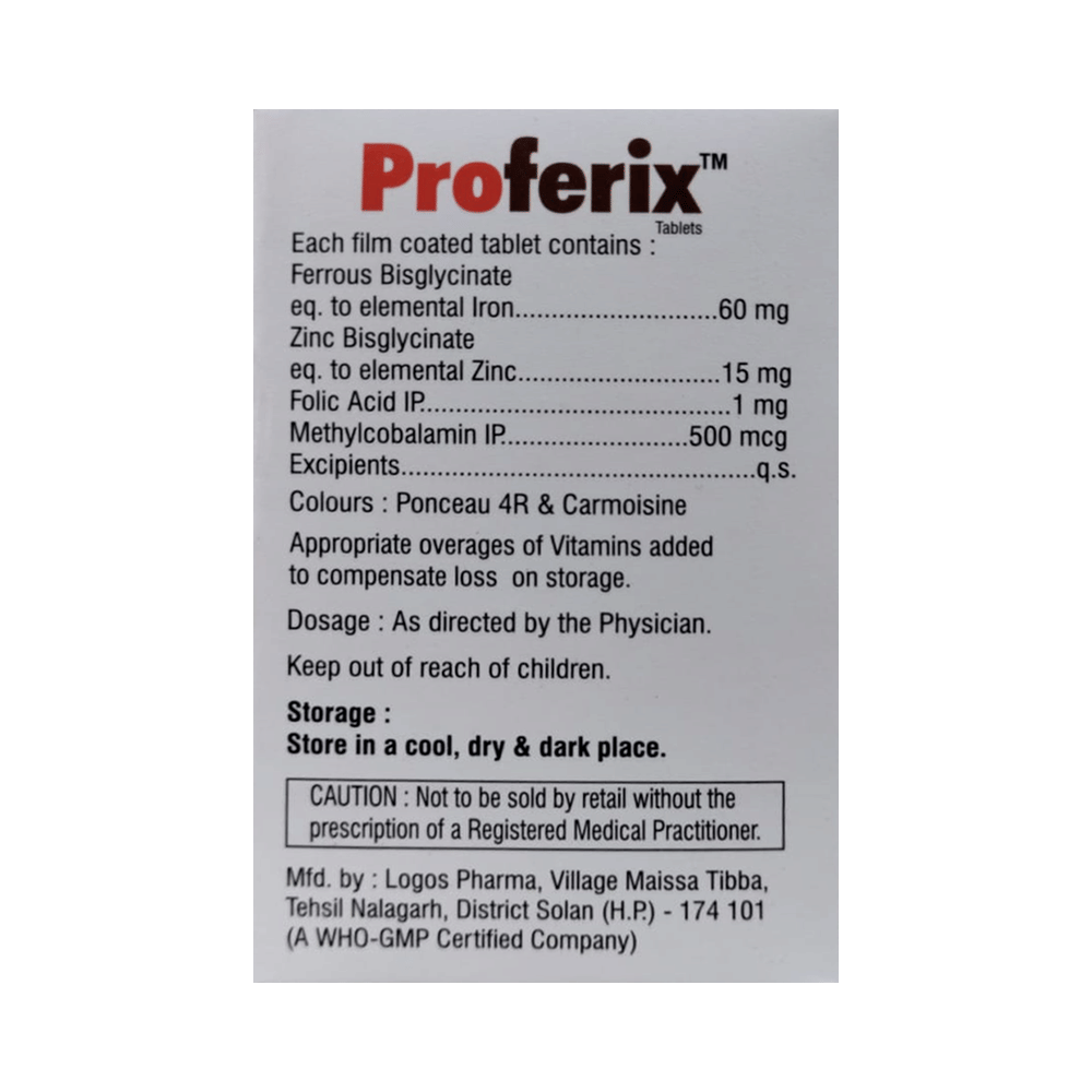 Proferix Tablet is a combination of vitamins and minerals. Iron replenishes the iron stores in the body and corrects iron deficiency anemia. Zinc is needed for the body's immune system to work properly. It plays a role in growth, wound healing, and maintaining gut health. Zinc is also needed for the senses of taste and smell. Folic acid is essential for production of red blood cells. It prevents and treats folate deficiency and anemia. When taken by pregnant women, Folic acid prevents miscarriage, preterm labor, and neural tube defects in infants. Vitamin B12 corrects vitamin B12 deficiency thereby helping in treating certain anemias and nerve problems.