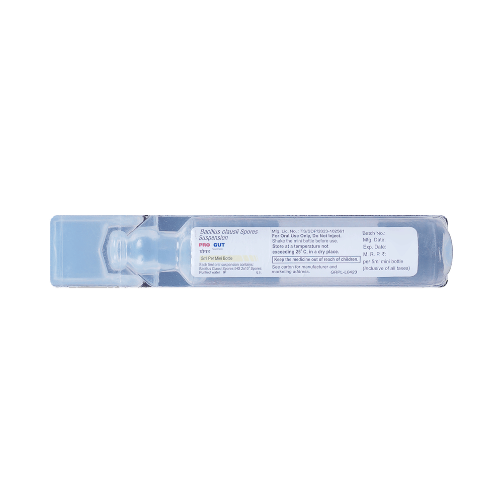 Progut Oral Suspension is a prescription medicine used in the treatment of diarrhea. This medicine is a probiotic works by restoring the balance of good bacteria in the intestine that may get upset after the use of antibiotics or due to intestinal infections. Progut Oral Suspension is taken with or without food in a dose and duration as advised by the doctor. You may take this medicine along with oral rehydration solution (ORS) as it will help to provide adequate fluid and electrolyte replacement. The dose you are given will depend on your condition and how you respond to the medicine. You should take this medicine until your doctor tells you to stop. Let your doctor know about all other medications you are taking as some may affect, or be affected by this medicine.The most common side effects are bloating and flatulence. Most of these are temporary and usually resolve with time. Contact your doctor straight away if you are at all concerned about any of these side effects.Before taking this medicine, you should let your doctor know if you have liver or kidney problems. Pregnant or breastfeeding women should also consult their doctor.