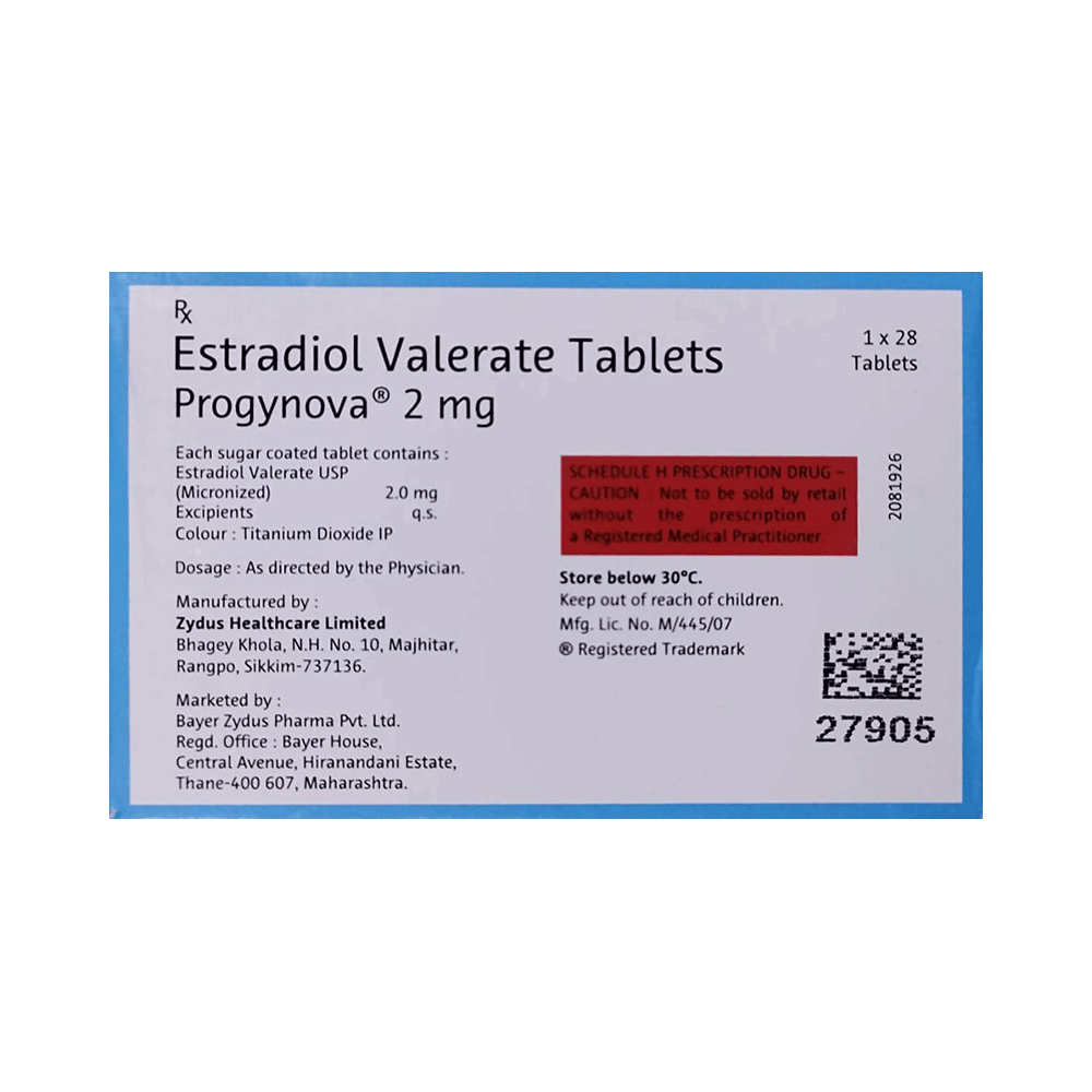 Progynova 2mg Tablet is a female sex hormone (estrogen). This is a type of hormone replacement therapy (HRT) that is used to treat symptoms associated with menopause (hot flushes, vaginal dryness, and itching), estrogen deficiency, and thinning of bones (osteoporosis). Progynova 2mg Tablet is to be swallowed with water. It can be taken with or without food, but remember to take it at a fixed time each day for better efficacy. The dose and duration will be decided by your doctor so that you get the right amount to control your symptoms. If you have missed a dose, take it as soon as you remember it. Do not skip any dose and finish the full course of treatment. The treatment should not be stopped abruptly without consulting your doctor as this may affect the potency of this medicine.The most common side effects of this HRT are headaches, breast pain, irregular vaginal bleeding or spotting, abdominal cramps or bloating, nausea, vomiting, and hair loss. Some of the warning signs and symptoms that need immediate medical attention are breast lumps, unusual vaginal bleeding, dizziness and faintness, severe headaches, chest pain, shortness of breath, pains in your legs, etc.Before taking this medicine, it is important to tell your doctor if you are taking or have recently taken any other medicines for the same disease or other diseases. Before you initiate with this HRT, you must consult the doctor if you have a history of unexplained vaginal bleeding or if you have ever had a blood clot in your legs or your lungs. If you are pregnant or breastfeeding, you should tell your doctor before taking this medicine. Your doctor may suggest you some diagnostic or laboratory tests to know the effects and side effects of this medicine on your body.