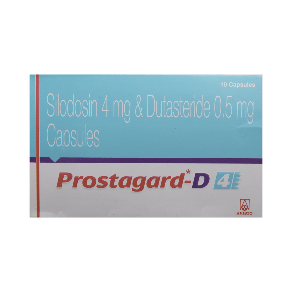 In Treatment of Benign prostatic hyperplasiaWhen your prostate gland becomes enlarged it can cause urinary problems such as difficulty passing urine and a need to go to the toilet frequently or urgently. It can also cause urine flow to be slower. If not treated, there is a risk that your urine flow will be completely blocked. Prostagard-D4 Capsule is a combination of two medicines that reduces the size of your prostate by blocking the production of a hormone which causes it to grow. Additionally, it relaxes the muscles in the bladder and prostate. Together they can rapidly relieve the symptoms and make it easier for you to urinate. However, it may take up to 6 months to notice the full benefits. Take this medicine exactly as prescribed for maximum benefits.
