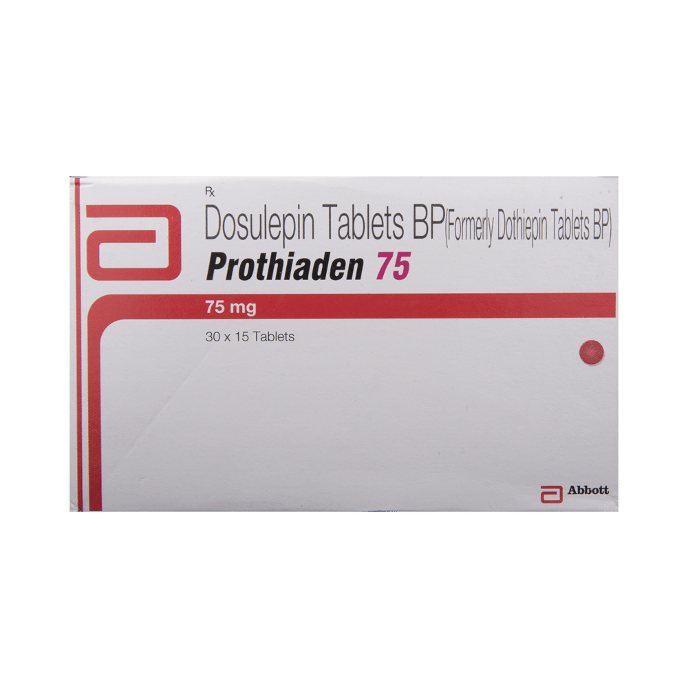Prothiaden 75 Tablet is a tricyclic antidepressant. It is mostly used to treat depression that is unresponsive to alternative treatment. It is also used in the management of anxiety disorder. Prothiaden 75 Tablet works by increasing the levels of chemical messengers in the brain that stabilizes and enhances the mood. It is better to take it before bedtime because it can make you feel drowsy. It can be taken with or without food, but you should take it at a fixed time each day for better efficacy. The dose and duration will be decided by your doctor so that you get the right amount to control your symptoms. Do not skip any dose and finish the full course of treatment even if you feel better. This medication must not be stopped suddenly without talking to the doctor. Your dose may be modified or gradually decreased before stopping the medication.The most common side effects of Prothiaden 75 Tablet include increased heart rate, blurred vision, dryness in the mouth, and constipation. Initially, this medicine may also cause a sudden drop in blood pressure, especially when you change positions. It may even cause dizziness and sleepiness, so do not drive or do anything that requires mental focus until you know how this medicine affects you. It may also lead to weight gain in some people. Most of the common side effects tend to be mild and temporary. Your doctor may be able to suggest ways of preventing or reducing them. Serious side effects associated with this medicine are rare.Before taking this medicine, it is important to tell your doctor if you are taking or have recently taken any other medicines for the same or any other diseases. Pregnant and breastfeeding women should take this medicine with proper consultation and caution. This medicine is not known to be addictive, but you can experience additional side effects (withdrawal symptoms) if you stop taking it suddenly. If you notice any sudden mood change or get suicidal or self-harm thoughts, you must consult the doctor without delay. Also, remember to take this medicine strictly as advised by the doctor as an overdose of this medication may lead to a serious health emergency. Consumption of alcohol should strictly be avoided as alcohol interacts with this medicine to cause serious health issues.
