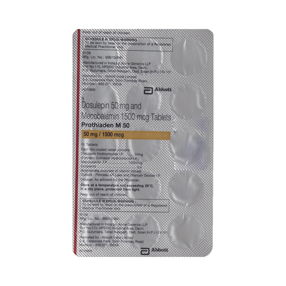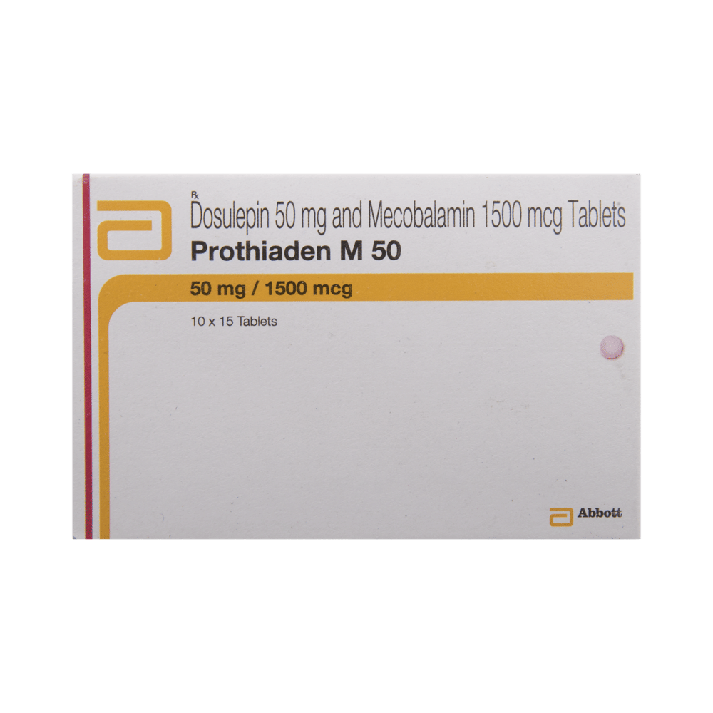 Prothiaden M 50 Tablet is a combination of two medicines used to treat neuropathic pain. It works by protecting the nerve fibers against damage, repairing the damaged nerves. This way it effectively relieves the pain sensation and also elevates the mood. Prothiaden M 50 Tablet may be taken with or without food. However, it is advised to take it at the same time each day as this helps to maintain a consistent level of medicine in the body. Take this medicine in the dose and duration advised by your doctor. If you miss a dose of this medicine, take it as soon as you remember. Finish the full course of the treatment even if you feel better. It is important not to stop taking this medicine suddenly.Some common side effects of this medicine include constipation, dry mouth, difficulty in urination, drowsiness, blurred vision, and increased heart rate. It may also cause dizziness and sleepiness, so do not drive or do anything that requires mental focus until you know how this medicine affects you. However, these are temporary and usually resolve on their own. Please consult your doctor if these do not subside or bother you.You should avoid alcohol while taking Prothiaden M 50 Tablet, as it may worsen certain side effects. This medicine can also lead to weight gain, eat a healthy balanced diet, avoid snacking with high-calorie food, and exercise regularly. Inform your doctor if you develop any unusual changes in mood or behavior, new or worsening depression, or suicidal thoughts or behavior.
