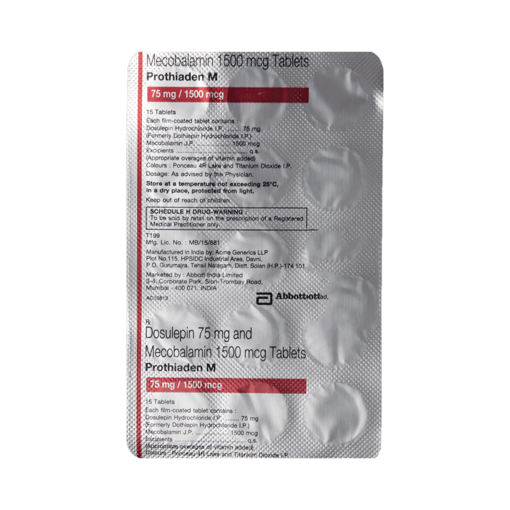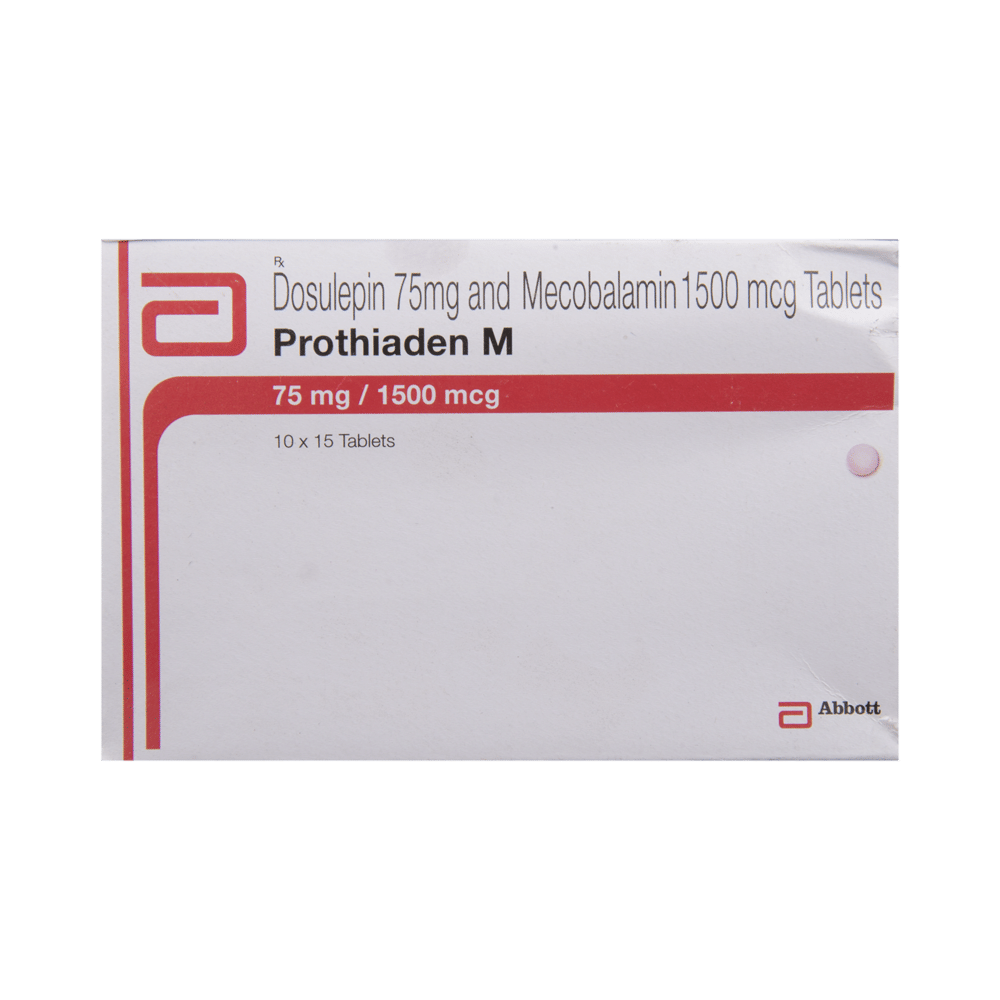 Prothiaden M 75mg/1500mcg Tablet is a combination of two medicines used to treat neuropathic pain. It works by protecting the nerve fibers against damage, repairing the damaged nerves. This way it effectively relieves the pain sensation and also elevates the mood. Prothiaden M 75mg/1500mcg Tablet may be taken with or without food. However, it is advised to take it at the same time each day as this helps to maintain a consistent level of medicine in the body. Take this medicine in the dose and duration advised by your doctor. If you miss a dose of this medicine, take it as soon as you remember. Finish the full course of the treatment even if you feel better. It is important not to stop taking this medicine suddenly.Some common side effects of this medicine include constipation, dry mouth, difficulty in urination, drowsiness, blurred vision, and increased heart rate. It may also cause dizziness and sleepiness, so do not drive or do anything that requires mental focus until you know how this medicine affects you. However, these are temporary and usually resolve on their own. Please consult your doctor if these do not subside or bother you.You should avoid alcohol while taking Prothiaden M 75mg/1500mcg Tablet, as it may worsen certain side effects. This medicine can also lead to weight gain, eat a healthy balanced diet, avoid snacking with high-calorie food, and exercise regularly. Inform your doctor if you develop any unusual changes in mood or behavior, new or worsening depression, or suicidal thoughts or behavior.