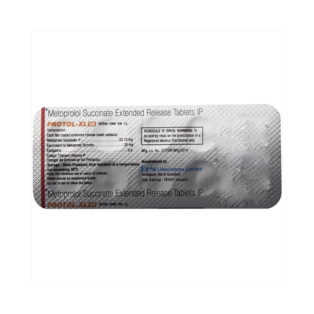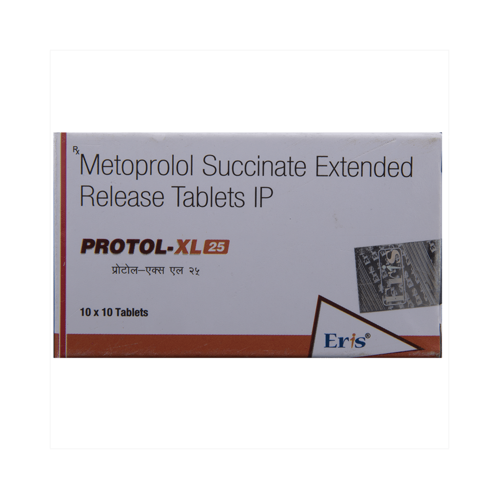 Protol-XL 25 Tablet belongs to a group of medicines called beta-blockers. It is used to treat high blood pressure (hypertension), angina (heart-related chest pain), and irregular heart rhythms (arrhythmia). It also helps prevent migraines, future heart attacks, and strokes. Protol-XL 25 Tablet may be prescribed alone or together with other medications. The dose and frequency will depend on what you are taking it for and the severity of your condition. It may be taken on an empty stomach or with a meal, but take it regularly at the same time each day to get the maximum benefit. It may take several weeks before you get the full benefit of this medicine, and you may need to take it for the rest of your life. However, it is important to continue taking it even if you feel well. Most people with high blood pressure do not have symptoms. If you stop taking it, your condition may worsen.The main side effects of Protol-XL 25 Tablet are tiredness, headache, depression, diarrhea, rash, slow heart rate, feeling dizzy, and nausea. These are usually mild and short-lived. It may also cause shortness of breath or low blood pressure in some people. To reduce the risk of side effects, your doctor will probably start the medicine at a low dose and gradually increase it. Consult your doctor if the side effects bother you or do not go away.Before taking it, let your doctor know if you have any liver problems. It may also not be suitable for people who have a slow heart rate, severe circulation problems, severe heart failure, or low blood pressure. Pregnant or breastfeeding mothers should also consult their doctor before taking it. You must talk to your doctor to find out whether this medicine is suitable for you to use. You should have your blood pressure checked regularly to make sure that this medicine is working properly. Avoid drinking alcohol, as it may increase certain side effects.