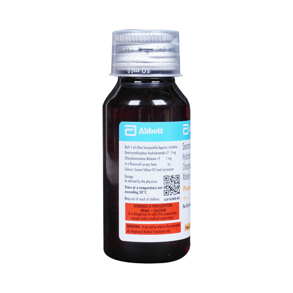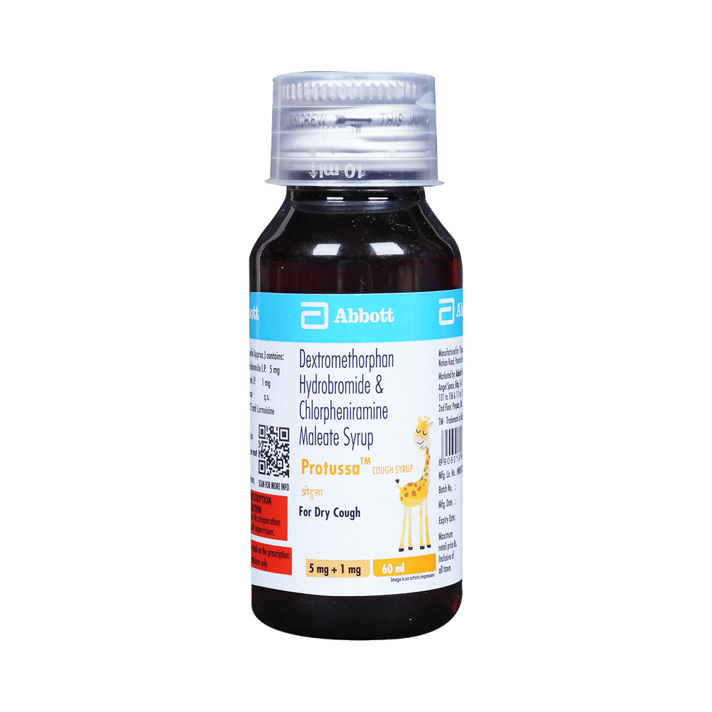 Protussa Cough Syrup is a combination of two medicines used in the treatment of dry cough. It can provide temporary relief of cough due to throat irritation, sneezing, and running nose. It works by reducing the activity of the brain's cough center and blocking the effects of histamine. Protussa Cough Syrup is taken with or without food in a dose and duration as advised by the doctor. The dose you are given will depend on your condition and how you respond to the medicine. You should keep taking this medicine for as long as your doctor recommends. If you stop treatment too early your symptoms may come back and your condition may worsen. Let your doctor know about all other medications you are taking as some may affect, or be affected by this medicine.The most common side effects are sedation, somnolence, and dizziness. Most of these are temporary and usually resolve with time. Contact your doctor straight away if you are at all concerned about any of these side effects. If you experience dizziness and sleepiness, so do not drive or do anything that requires mental focus until you know how this medicine affects you. Avoid drinking alcohol while taking this medicine as it can make dizziness worse.It is beneficial to have plenty of fluids while taking this medication. Before taking it, you should tell your doctor if you have liver diseases so that your doctor can prescribe a suitable dose for you. Pregnant or breastfeeding women should also consult their doctor before taking this medicine.