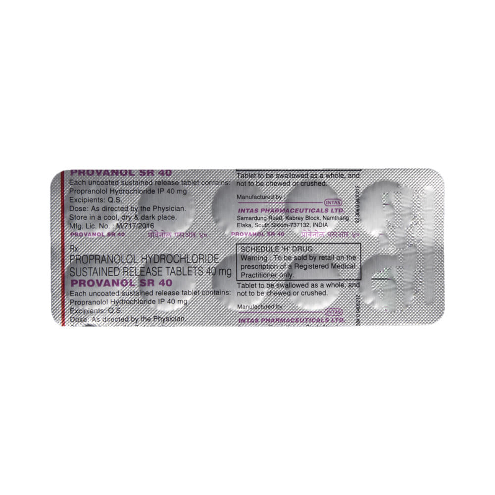 Provanol SR 40 Tablet is a medicine used to prevent angina (chest pain) and migraine, and manage pheochromocytoma (a rare adrenal gland tumor). It works by slowing the heart rate and relaxing blood vessels, helping to reduce strain on the heart and improve blood flow. Take Provanol SR 40 Tablet in the dose and duration prescribed by your doctor. It will depend on what you are being treated for and how you respond to the medicine. You should always take it as prescribed by the doctor. It can be taken with or without food. You should keep taking it even if you feel well, as you are still getting the benefits. If you stop taking it suddenly, your condition may worsen.The most common side effects of Provanol SR 40 Tablet include tiredness, dizziness, weakness, cold fingers or toes, and stomach pain. You may also experience nausea, vomiting, and diarrhea. Talk to your doctor if the side effects bother you or do not go away. Most side effects are short-lived and improve as your body gets used to the medicine.You should not use Provanol SR 40 Tablet if you have asthma, very slow or uneven heartbeats, or a serious heart condition, including heart failure. Talk to your doctor before taking it if you have kidney or liver problems or chronic obstructive pulmonary disease (COPD). In terms of lifestyle, alcohol may affect the way this medicine works and should be avoided. You should not drive if this medicine makes you feel dizzy. Ask your doctor whether it is safe to take this medicine if you are pregnant or breastfeeding.