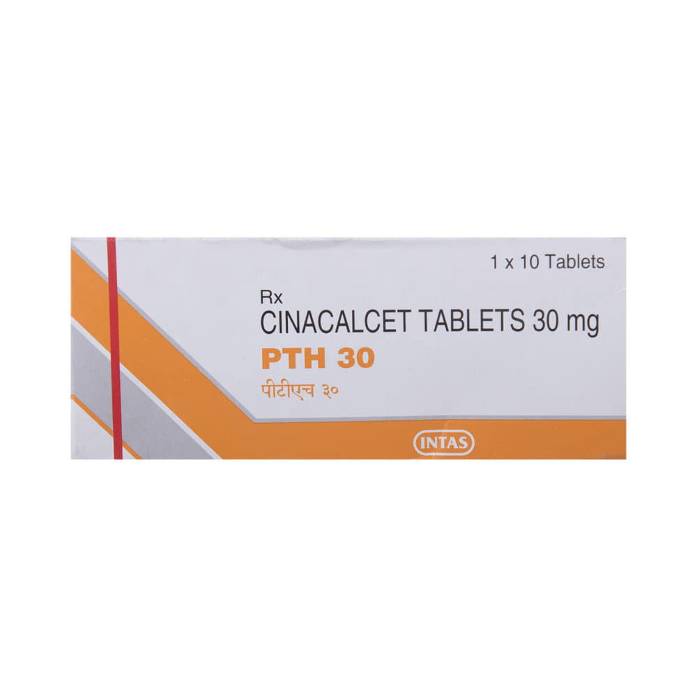 Pth 30 Tablet is used to treat high calcium levels in the blood and hyperparathyroidism. It works by controlling the levels of parathyroid hormone (PTH), calcium, and phosphorus in your body. Pth 30 Tablet may be used alone or in combination with other medicines. It best taken with a meal or shortly after a meal. Take it exactly as prescribed by your doctor. Your doctor will decide the dose and how often you should take them. You should take this medicine regularly to get the most benefit from it. Do not stop taking the medicine even if you feel better unless the doctor tells you so.The most common side effects of this medicine include vomiting, nausea, rash, muscle pain, diarrhea, hypertension, dizziness, chest pain, and loss of appetite. Let your doctor know if any of these side effects do not go away with time or get worse, or if you experienced any other symptoms which you think are caused by this medicine.Before using this medicine, inform your doctor if you have any problems with your heart, liver, or ever had seizures (fits or convulsions). You should also tell your doctor all the other medications you are taking. If you have low levels of calcium in your body, you should not take this medicine. Your doctor may monitor your blood calcium level while on treatment with this medicine. Pregnant and breastfeeding mothers should ask their doctors' advice before taking this medicine.