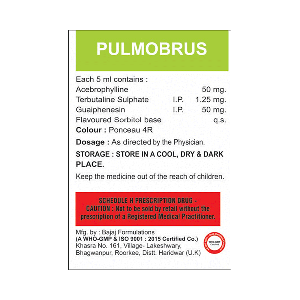 Pulmobrus Syrup Mix Fruit Sugar Free relieves cough accompanied with mucus that is associated with broncho-pulmonary disorders such as bronchitis, bronchial asthma and emphysema.