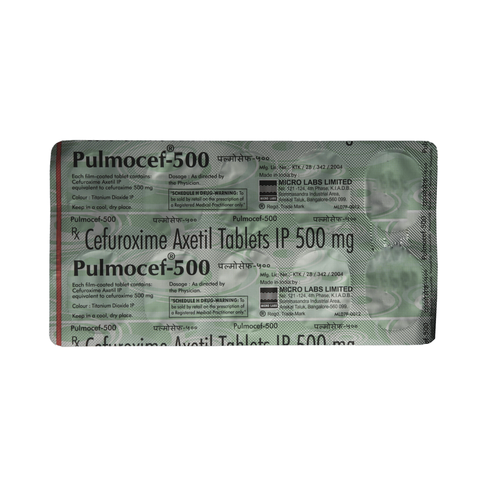 Pulmocef 500 Tablet is an antibiotic medicine used to treat bacterial infections in your body. It is effective in infections of the lungs (e.g., pneumonia), ear, throat, nasal sinus, urinary tract, skin, soft tissues, bones, and joints. It is also used to prevent infections during surgery. Pulmocef 500 Tablet should be taken with food to avoid an upset stomach. You should take it regularly at evenly spaced intervals as per the schedule prescribed by your doctor. Taking it at the same time every day will help you to remember to take it. The dose will depend on what you are being treated for, but you should always complete a full course of this antibiotic as prescribed by your doctor. Do not stop taking it until you have finished, even when you feel better. If you stop taking it early, some bacteria may survive and the infection may come back. It will not work for viral infections such as flu or the common cold. Using any antibiotic when you do not need it can make it less effective for future infections.The most common side effects of this medicine include rash, vomiting, increased liver enzymes, nausea, and diarrhea. These are usually mild but let your doctor know if they bother you or last more than a few days.Before using it, you should tell your doctor if you are allergic to any antibiotics or have any kidney or liver problems. You should also let your doctor know all other medicines you are taking as they may affect, or be affected by this medicine. Pregnant and breastfeeding mothers should consult their doctor before using it.