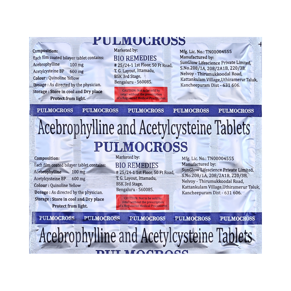 Pulmocross Tablet is a combination of two medicines: Acebrophylline and Acetylcysteine. Acebrophylline is a mucolytic and bronchodilator. It works by relaxing the muscles of the airways and also thins and loosens mucus, making it easier to breathe. Acetylcysteine is a mucolytic medication. It thins and loosens mucus (phlegm), making it easier to cough out.