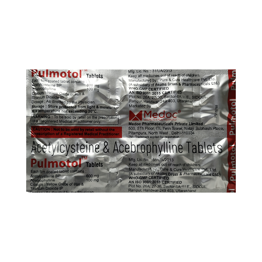 Pulmotol Tablet is a combination of two medicines: Acebrophylline and Acetylcysteine. Acebrophylline is a mucolytic and bronchodilator. It works by relaxing the muscles of the airways and also thins and loosens mucus, making it easier to breathe. Acetylcysteine is a mucolytic medication. It thins and loosens mucus (phlegm), making it easier to cough out.