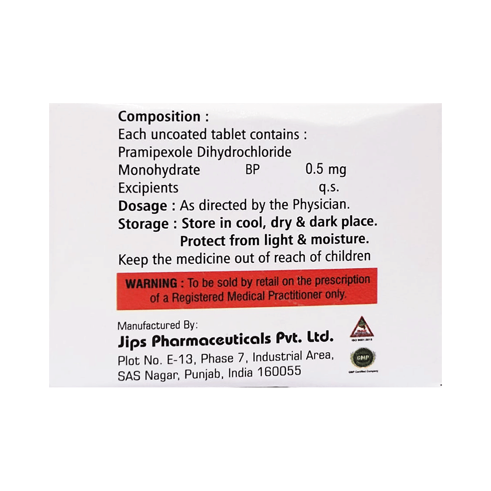 Pxol 0.5 Tablet is used in the treatment of Parkinson's disease and restless leg syndrome (an urge to move the legs usually accompanied or caused by uncomfortable and unpleasant leg sensations). It helps to treat excessive shaking by slowing down the body movements. Pxol 0.5 Tablet should be taken with food. However, take it at the same time each day as this helps to maintain a consistent level of medicine in the body. Take this medicine in the dose and duration as advised by your doctor and if you have missed a dose, take it as soon as you remember it. You should never skip any doses and finish the full course of treatment even if you feel better. This medication must not be stopped suddenly without talking to your doctor.Some common side effects of this medicine include nausea, dry mouth, fatigue, hallucinations, constipation, and peripheral edema. It also causes dizziness and sleepiness, so do not drive or do anything that requires mental focus until you know how this medicine affects you. Inform your doctor if you develop any unusual changes in mood, an abnormally high sex drive, an urge to gamble, or uncontrolled spending as these may prove very harmful.