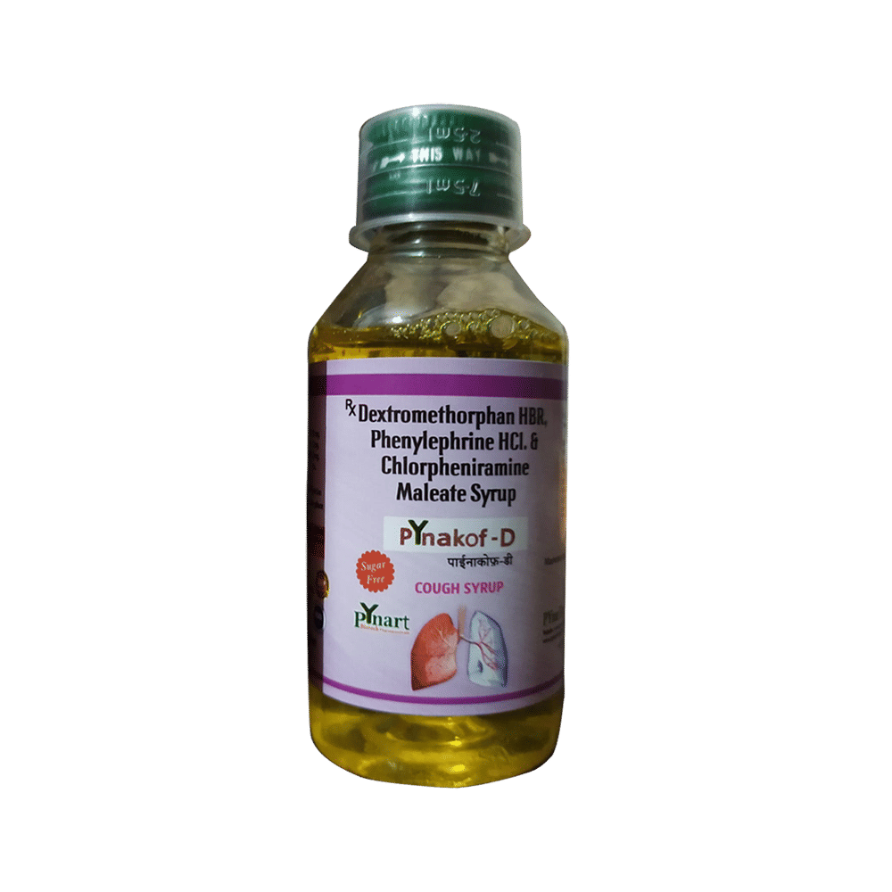 Pynakof-D Syrup is a combination of three medicines: Phenylephrine, Chlorpheniramine Maleate, and Dextromethorphan Hydrobromide. Phenylephrine is a decongestant which narrows the small blood vessels providing relief from congestion or stuffiness in the nose. Chlorpheniramine Maleate is an antiallergic which relieves allergy symptoms like runny nose, watery eyes and sneezing. Dextromethorphan Hydrobromide is a cough suppressant which relieves cough by reducing the activity of cough center in the brain.