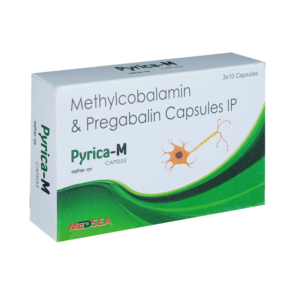 Pyrica-M Capsule is a prescription medicine used for the treatment of neuropathic pain. It decreases pain by modulating the calcium channel activity of the nerve cells. This medicine also protects nerve fibers and heals damaged nerve cells. Pyrica-M Capsule may be taken with or without food, preferably at bedtime. It is advised to take it at the same time each day as this helps to maintain a consistent level of medicine in the body. Take this medicine in the dose and duration advised by your doctor. If you miss a dose of this medicine, take it as soon as you remember. Finish the full course of treatment even if you feel better. This medication must not be stopped suddenly without talking to the doctor.Some common side effects of this medicine include nausea, vomiting, diarrhea, constipation, blurred vision, dizziness, and sleepiness. Do not drive or do anything that requires mental focus until you know how this medicine affects you. The side effects are mild and usually improve with time. It may also cause weight gain in some people. Exercise regularly and have a balanced diet to keep your weight in check. Inform your doctor if you develop any unusual changes in mood or behavior, new or worsening depression, or suicidal thoughts.Your doctor should also know about all other medicines you are taking, as many of these may make this medicine less effective or change the way it works. Inform your doctor if you are pregnant, planning pregnancy, or breastfeeding to make sure it is safe for you and the developing baby.