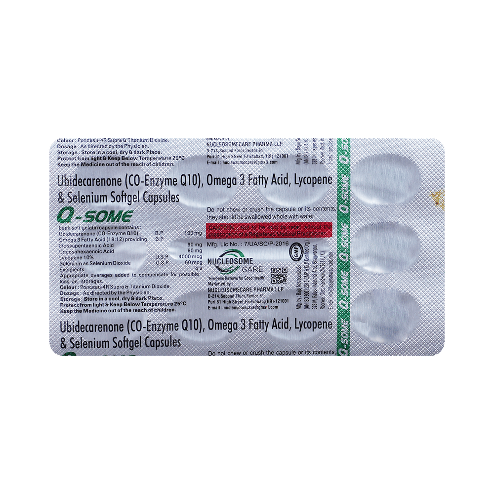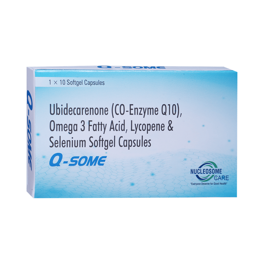 Q-Some Softgel Capsule is a combination of vitamins, antioxidants, and minerals. Coenzyme Q10 is a fat-soluble compound that helps the mitochondria (the powerhouse of cells) convert food into energy, and it's also an antioxidant. Docosahexaenoic acid (DHA) is vital for the growth and functional development of the brain in babies. In adults, It is also needed for maintenance of normal brain function. DHA improves learning ability, whereas deficiencies of DHA are associated with deficits in learning. Eicosapentaenoic acid prevents the blood from clotting easily, reduces triglyceride levels, and may reduce pain and swelling. Lycopene protects the body from damaging molecules called free radicals and helps boost the immune system. Selenium dioxide acts as a resource of selenium that prevents cell damage and protects the body from the poisonous effects of heavy metals and harmful radicals.