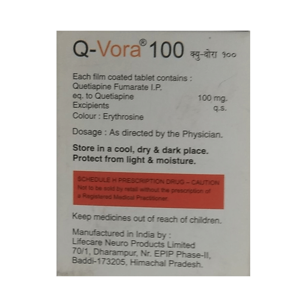 Q-Vora 100mg Tablet is an atypical antipsychotic. It works by modulating the action of certain chemical messengers in the brain that affect thoughts.