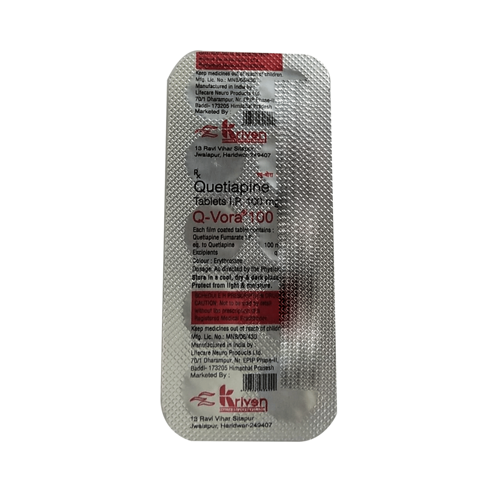 Q-Vora 100mg Tablet is used in the treatment of schizophrenia (a mental disorder that can result in hallucinations or delusions and also adversely affects a person’s ability to think and behave) and mania. It is also used to treat bipolar disorders. Q-Vora 100mg Tablet may be taken with or without food. However, it is advised to take it at the same time each day as this helps to maintain a consistent level of medicine in the body. Take this in the dose and duration as advised by your doctor and if you have missed a dose, take it as soon as you remember. It is important that this medication is not stopped suddenly without talking to your doctor as it may worsen your symptoms. However, discontinue this medicine immediately if you experience Neuroleptic malignant syndrome (NMS), characterized by fever, muscle rigidity, and altered consciousness or seizures.Some common side effects of this medicine include decreased hemoglobin levels in the blood, increased triglycerides level in blood, decreased cholesterol level in blood, headache, extrapyramidal symptoms, dry mouth, and withdrawal symptoms. Initially, this medicine may cause a sudden drop in blood pressure when you change positions, so it is better to rise slowly if you have been sitting or lying down. It also causes dizziness and sleepiness, so do not drive or do anything that requires mental focus until you know how this medicine affects you. This medicine may increase your weight but, modifying your lifestyle by having a healthy diet and exercising regularly can reduce this side effect.You should be cautious while using this medicine as it may increase the risk of developing diabetes, so it is better to monitor glucose regularly. Inform your doctor if you develop any unusual changes in mood or behavior, new or worsening depression, or suicidal thoughts while taking this medicine.