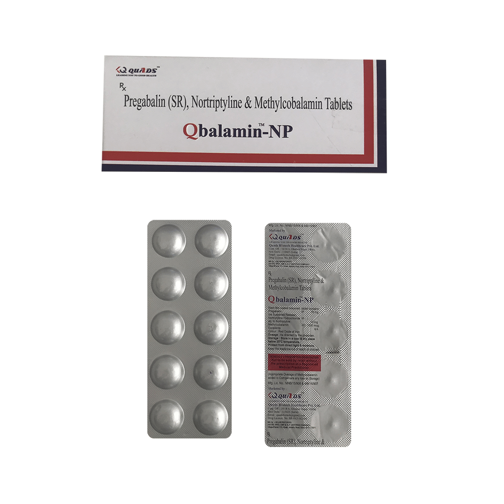 Qbalamin-NP Tablet SR is a combination of three medicines: Pregabalin, Nortriptyline and Methylcobalamin. Pregabalin is an alpha 2 delta ligand which decreases pain by modulating calcium channel activity of the nerve cells. Nortriptyline is a tricyclic antidepressant which increases the levels of chemical messengers (serotonin and noradrenaline) that stop the movement of pain signals in the brain. Methylcobalamin is a form of vitamin B which helps in the production of myelin, a substance that protects nerve fibers and rejuvenates damaged nerve cells. Together, they relieve neuropathic pain (pain from damaged nerves).