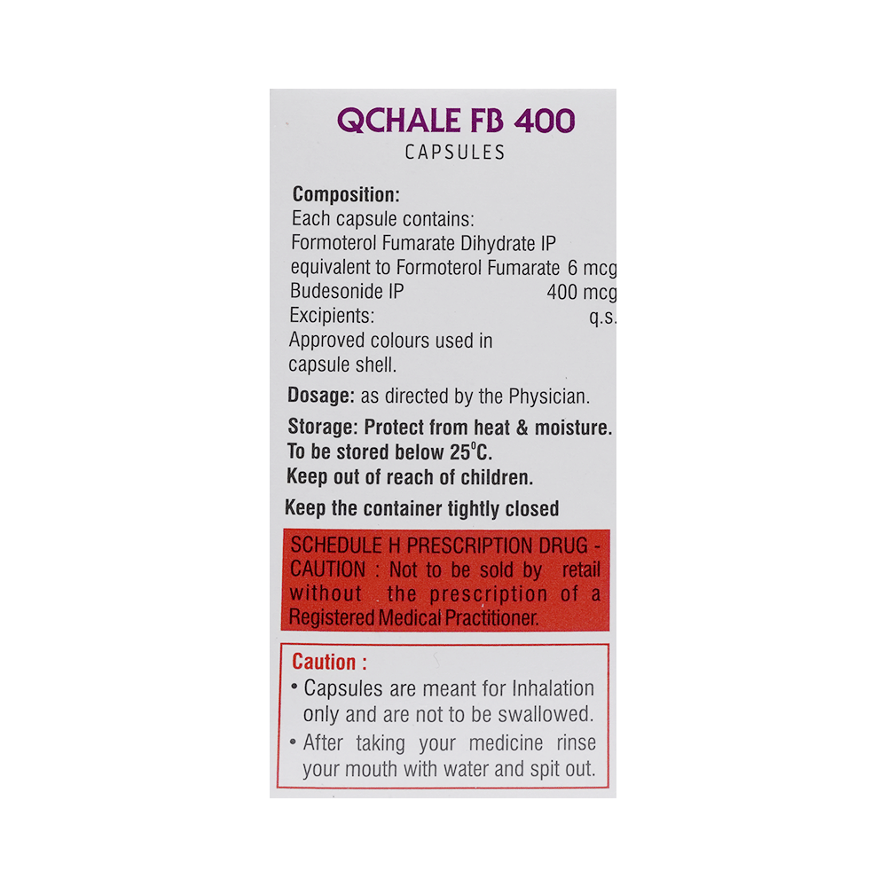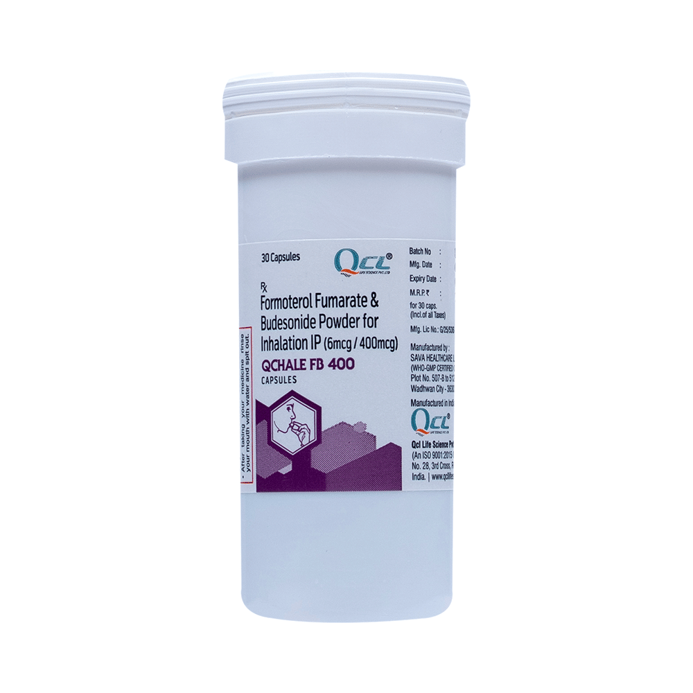 Qchale FB 400 Capsule is a combination of two medicines in one inhaler. It relieves the long-term symptoms of asthma and COPD, making breathing easier. It works by inhibiting the release of certain chemical messengers that cause inflammation (swelling) and relaxes the muscles in the airways. Your doctor will tell you how often you need to use your inhaler. The effect of this medicine may be noticeable after a few days but will only reach its maximum after a few weeks. This medicine must be used regularly to be effective, so go on taking it even if you don't have any symptoms. That means it’s doing its job. If you stop taking it your symptoms may get worse. This medicine should not be used to relieve sudden shortness of breath. If sudden shortness of breath occurs, use your rescue inhaler. To get the benefit from this medicine you need to make sure you get your inhaler technique right, otherwise, it does not work as well.The most common side effects include headache, nausea, vomiting, stomach discomfort, and respiratory tract infection. If you get there, don’t stop taking it but do talk to your doctor. You can prevent some of these symptoms by rinsing your mouth and throat with water or brushing your teeth after using your inhaler. There are other, rarer side effects which can be serious. Talk to your doctor if you're worried about them.Before taking it, you should tell your doctor if you have any kidney or liver diseases so that your doctor can prescribe a suitable dose for you. You should also tell your doctor if you are pregnant, planning pregnancy or breastfeeding.
