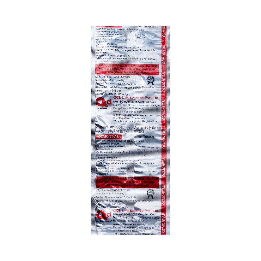 Qcmont-AB Tablet SR helps prevent and treat asthma and chronic obstructive pulmonary disorder (COPD). It helps relax the muscles of the air passages, thereby making it easier to breathe. It is also used to treat bronchitis. Qcmont-AB Tablet SR is taken with or without food in a dose and duration as advised by the doctor. The dose you are given will depend on your condition and how you respond to the medicine. You should keep taking this medicine for as long as your doctor recommends. If you stop treatment too early, your symptoms may come back, and your condition may worsen. Let your healthcare team know about all other medications you are taking, as some may affect or be affected by this medicine.The most common side effects are vomiting, heartburn, stomach pain, rash, itching, and breathing difficulty. Most of these are temporary and usually resolve with time. Contact your doctor straight away if you are at all concerned about any of these side effects. This medicine may also cause dizziness and sleepiness, so do not drive or do anything that requires mental focus until you know how this medicine affects you. Avoid drinking alcohol while taking this medicine, as it can worsen your sleepiness.Before taking it, you should tell your doctor if you have any kidney or liver diseases so that your doctor can prescribe a suitable dose for you. You should also tell your doctor if you are pregnant, planning pregnancy, or breastfeeding.