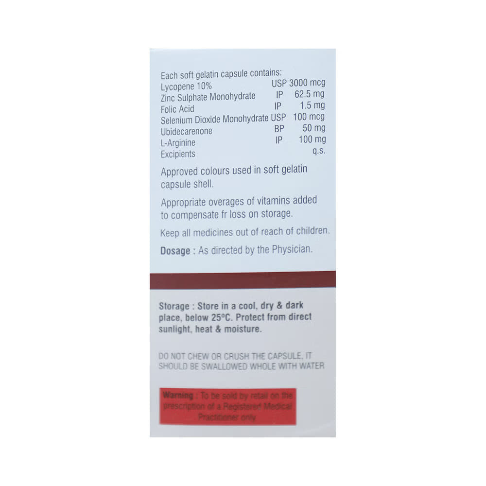 Salt Composition: Coenzyme Q10 (50mg) + Lycopene (3000mcg) + Zinc Sulphate Monohydrate (62.5mg) + Selenium (100mcg) + Folic Acid (1.5mg) + L-Arginine (100mg)