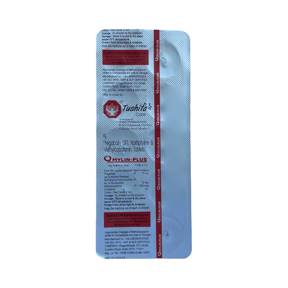 Qmylin-Plus Tablet SR is a combination of three medicines: Pregabalin, Nortriptyline and Methylcobalamin. Pregabalin is an alpha 2 delta ligand which decreases pain by modulating calcium channel activity of the nerve cells. Nortriptyline is a tricyclic antidepressant which increases the levels of chemical messengers (serotonin and noradrenaline) that stop the movement of pain signals in the brain. Methylcobalamin is a form of vitamin B which helps in the production of myelin, a substance that protects nerve fibers and rejuvenates damaged nerve cells. Together, they relieve neuropathic pain (pain from damaged nerves).