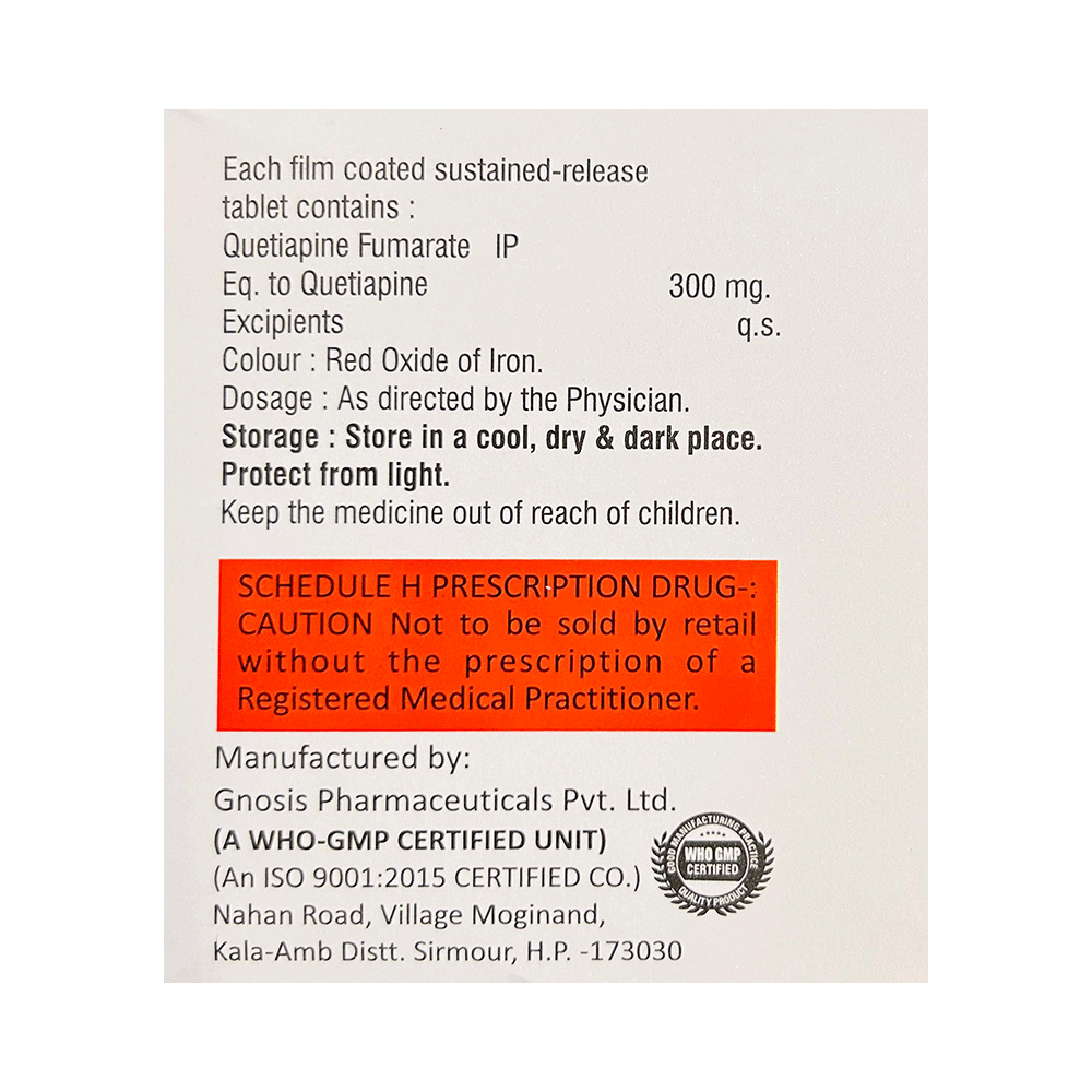 Qtajas SR 300mg Tablet PR is used in the treatment of schizophrenia (a mental disorder that can result in hallucinations or delusions and also adversely affects a person’s ability to think and behave) and mania. It is also used to treat bipolar disorders. Qtajas SR 300mg Tablet PR may be taken with or without food. However, it is advised to take it at the same time each day as this helps to maintain a consistent level of medicine in the body. Take this in the dose and duration as advised by your doctor and if you have missed a dose, take it as soon as you remember. It is important that this medication is not stopped suddenly without talking to your doctor as it may worsen your symptoms. However, discontinue this medicine immediately if you experience Neuroleptic malignant syndrome (NMS), characterized by fever, muscle rigidity, and altered consciousness or seizures.Some common side effects of this medicine include decreased hemoglobin levels in the blood, increased triglycerides level in blood, decreased cholesterol level in blood, headache, extrapyramidal symptoms, dry mouth, and withdrawal symptoms. Initially, this medicine may cause a sudden drop in blood pressure when you change positions, so it is better to rise slowly if you have been sitting or lying down. It also causes dizziness and sleepiness, so do not drive or do anything that requires mental focus until you know how this medicine affects you. This medicine may increase your weight but, modifying your lifestyle by having a healthy diet and exercising regularly can reduce this side effect.You should be cautious while using this medicine as it may increase the risk of developing diabetes, so it is better to monitor glucose regularly. Inform your doctor if you develop any unusual changes in mood or behavior, new or worsening depression, or suicidal thoughts while taking this medicine.