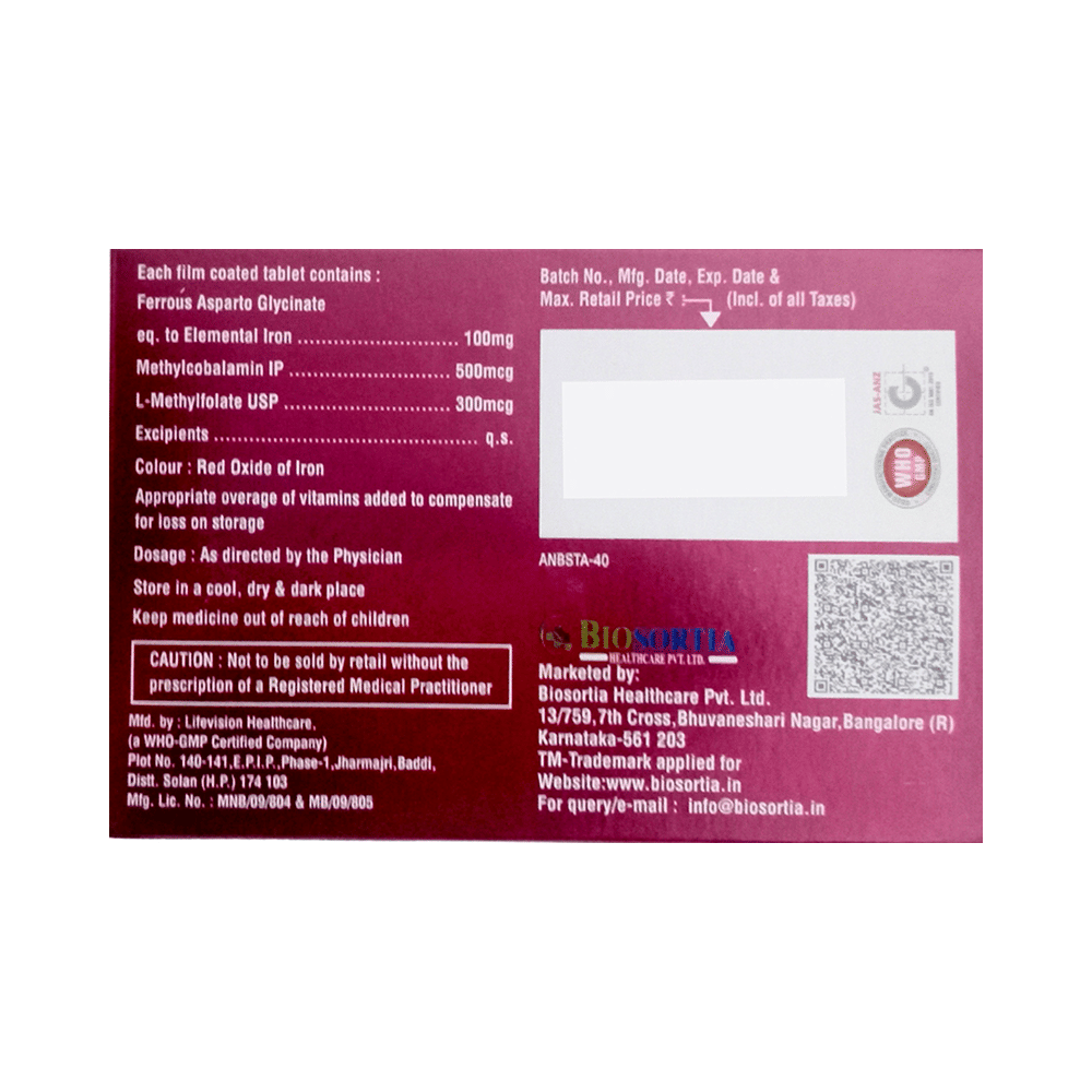 Salt Composition: L-Methyl Folate (300mcg) + Methylcobalamin (500mcg) + Iron (100mg)