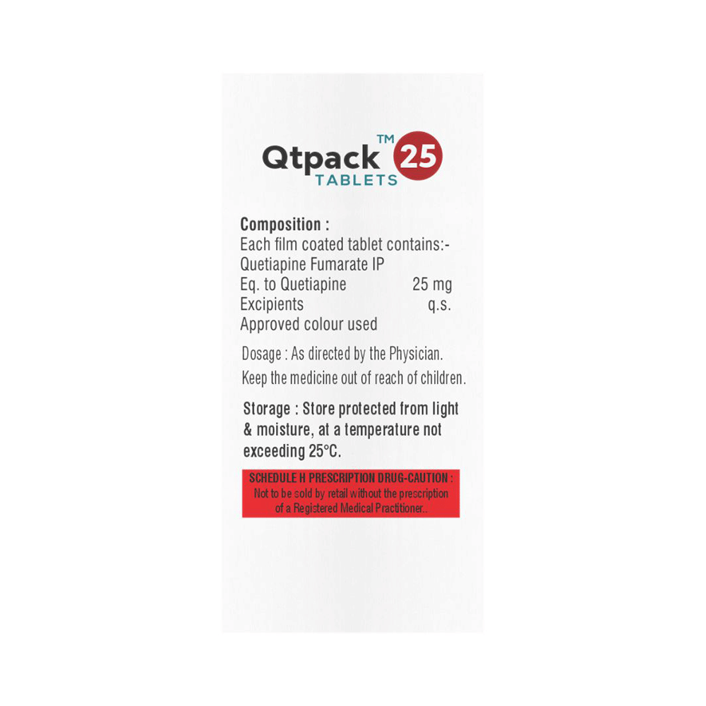 Qtpack 25 Tablet is used in the treatment of schizophrenia (a mental disorder that can result in hallucinations or delusions and also adversely affects a person’s ability to think and behave) and mania. It is also used to treat bipolar disorders. Qtpack 25 Tablet may be taken with or without food. However, it is advised to take it at the same time each day as this helps to maintain a consistent level of medicine in the body. Take this in the dose and duration as advised by your doctor and if you have missed a dose, take it as soon as you remember. It is important that this medication is not stopped suddenly without talking to your doctor as it may worsen your symptoms. However, discontinue this medicine immediately if you experience Neuroleptic malignant syndrome (NMS), characterized by fever, muscle rigidity, and altered consciousness or seizures.Some common side effects of this medicine include decreased hemoglobin levels in the blood, increased triglycerides level in blood, decreased cholesterol level in blood, headache, extrapyramidal symptoms, dry mouth, and withdrawal symptoms. Initially, this medicine may cause a sudden drop in blood pressure when you change positions, so it is better to rise slowly if you have been sitting or lying down. It also causes dizziness and sleepiness, so do not drive or do anything that requires mental focus until you know how this medicine affects you. This medicine may increase your weight but, modifying your lifestyle by having a healthy diet and exercising regularly can reduce this side effect.You should be cautious while using this medicine as it may increase the risk of developing diabetes, so it is better to monitor glucose regularly. Inform your doctor if you develop any unusual changes in mood or behavior, new or worsening depression, or suicidal thoughts while taking this medicine.