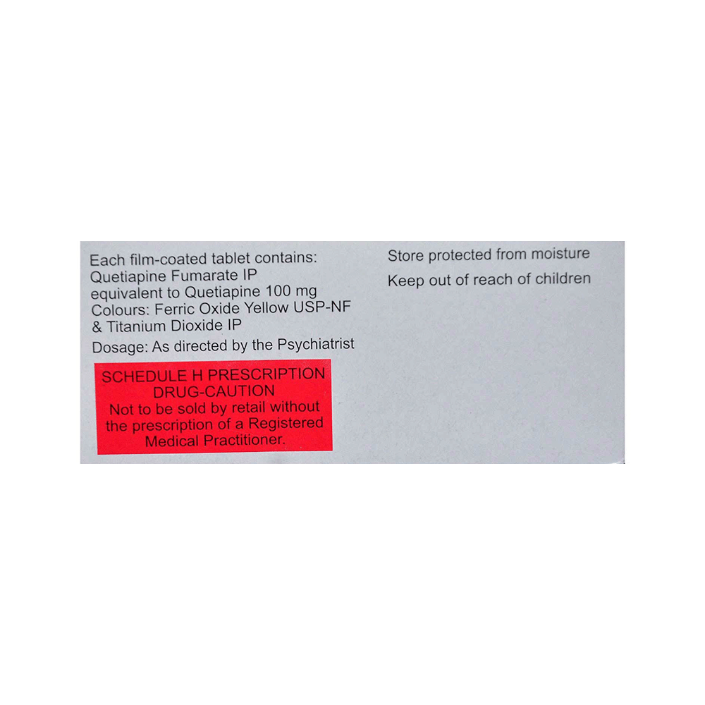 Quel 100 Tablet is used in the treatment of schizophrenia (a mental disorder that can result in hallucinations or delusions and also adversely affects a person’s ability to think and behave) and mania. It is also used to treat bipolar disorders. Quel 100 Tablet may be taken with or without food. However, it is advised to take it at the same time each day as this helps to maintain a consistent level of medicine in the body. Take this in the dose and duration as advised by your doctor and if you have missed a dose, take it as soon as you remember. It is important that this medication is not stopped suddenly without talking to your doctor as it may worsen your symptoms. However, discontinue this medicine immediately if you experience Neuroleptic malignant syndrome (NMS), characterized by fever, muscle rigidity, and altered consciousness or seizures.Some common side effects of this medicine include decreased hemoglobin levels in the blood, increased triglycerides level in blood, decreased cholesterol level in blood, headache, extrapyramidal symptoms, dry mouth, and withdrawal symptoms. Initially, this medicine may cause a sudden drop in blood pressure when you change positions, so it is better to rise slowly if you have been sitting or lying down. It also causes dizziness and sleepiness, so do not drive or do anything that requires mental focus until you know how this medicine affects you. This medicine may increase your weight but, modifying your lifestyle by having a healthy diet and exercising regularly can reduce this side effect.You should be cautious while using this medicine as it may increase the risk of developing diabetes, so it is better to monitor glucose regularly. Inform your doctor if you develop any unusual changes in mood or behavior, new or worsening depression, or suicidal thoughts while taking this medicine.